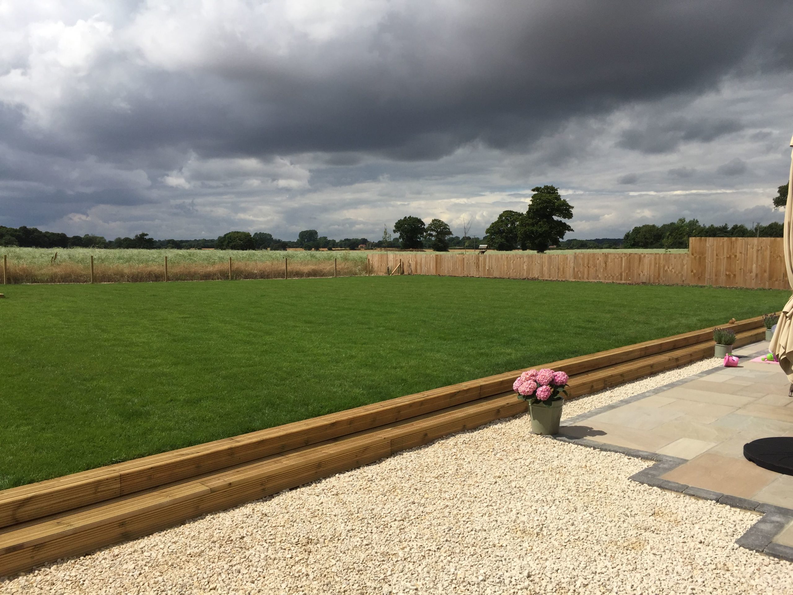 We started by removing the old patio area, in which we cleared from site. Next we laid a new hardcore foundation and drainage for the new patio area. Once completed we then laid the new Raj green patio area. Then we reformed the current soil and added additional landscaping soil ready for turfing. We then installed a sleeper edged play area with play bark. Using more sleepers we created steps to split the level of the lawn and patio. Once this had been finished we laid the new lawn turf to complete the garden area. Finally to finish of the patio area we laid Costwold stone with charcoal block edging.