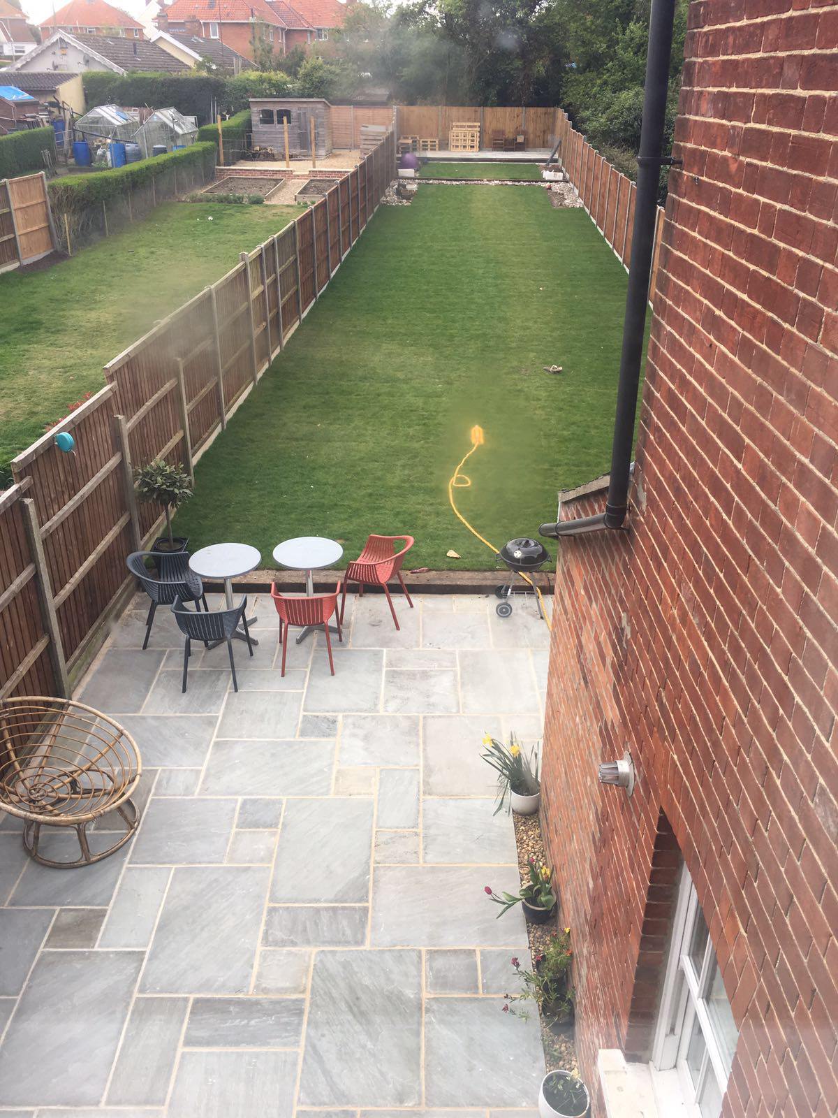 We then laid another patio area, around the foot print of the house. The patio was laid with drainage to catch all surface water. Patios were all laid with a grey Indian sandstone and pointed with a white mortar mix the finish