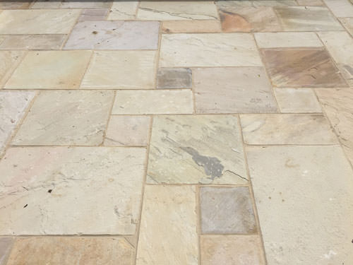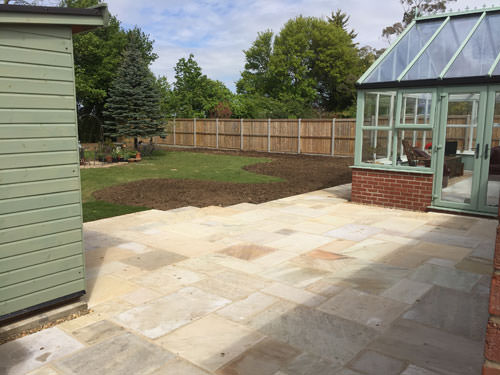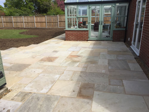 For the job we excavated all of the heavy clay to get ready for the new paving and driveway areas. First major part of the construction job was the patio area. We used crushed hardcore as the foundation for the patio; which gives a strong and solid base . This was then constructed by using Fossil Mint Indian Sandstone paving slabs.