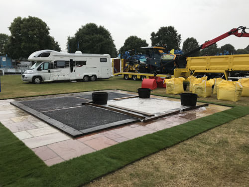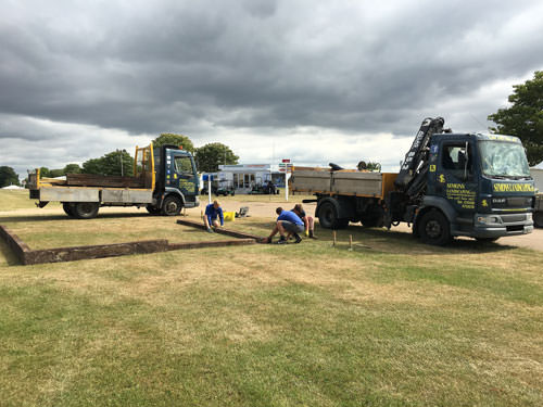 For the 2017 Norfolk Show Simons Landscaping wanted to make it bigger and better than 2016. We started off with a bigger and more accessible pitch. The centre piece of the stand took 2 days to complete with a team of two. This comprised of: Tarmac, Tar and Shingle, Tarmac and Golden stone and Tarmac and Red stone. This was surrounded by reclaimed oak sleeps and divided by Chelsea Set edgings. The whole piece was then surrounded by Indian Sandstone paving slabs in four options: Modak, Raveena, Raj Green and Fossil Mint. To finish the design we laid turfing around the Indian Sand Stone slabs.