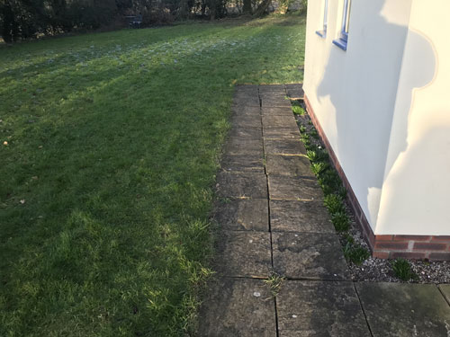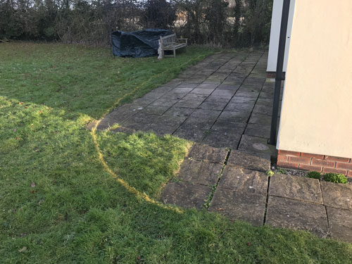 Once the foundation work had been completed, our team then started work on the new patio area and pathways. The Indian sandstone slabs that were chosen are called Modak. We laid the Modak slabs with burnt amber Chelsea set edgings. A pathway was then laid around the perimeter of the property to connect the new driveway to the patio.