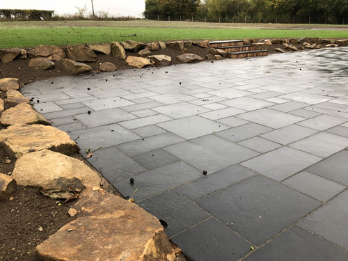 Next we moved onto completing the patio area. The customer wanted a contrast of using Buff sawn sandstone steps and a Charcoal limestone patio area around the house. As we had already laid the foundation for the patio area, on the second half of the installation we just had to lay the slabs. The slabs were then decorated with some natural stones around parts of the perimeter. This allowed the patio area to be framed and allowed it to “pop” with colour.