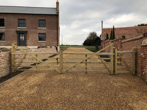 To finish the preparation of the landscape overhaul in Forncett, our team had to prepare the driveway area. We ensured that the foundation was compact and dense, providing a good base for the driveway. Our customer wanted a tar and shingle driveway. To start this we sprayed hot tar over the foundation and laid shingle on top. Once laid this was rolled over, to ensure that this is embedded in before setting. To finish the driveway we installed a set of five bar entrance gates at the start of the driveway.