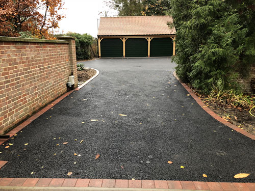 When finished installing the type one draining system, this then gave the opportunity to lay the permeable Asphalt tarmac base. This will also allow water to drain through; creating a full draining surface. Another main benefit of using a permeable asphalt tarmac base, is that it provides a very strong and firm foundation for the Resin aggregate to be laid on. The final step was to lay Burnt Amber Chelsea set edging around the perimeter of the driveway area. This was done to help frame the driveway and more importantly allow the Resin aggregate to bond to.