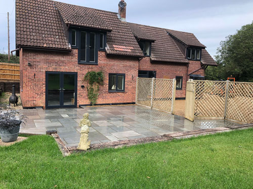 Continuing on the project our team got to work on installing the patio area. The customer had decided to go for Kandla Grey Indian Sandstone slabs. This helped to create a contrast of the grey frames for the windows and red bricks. Next out team installed the diamond trellace fence panels and gate. This created the divide from the front driveway area and patio.