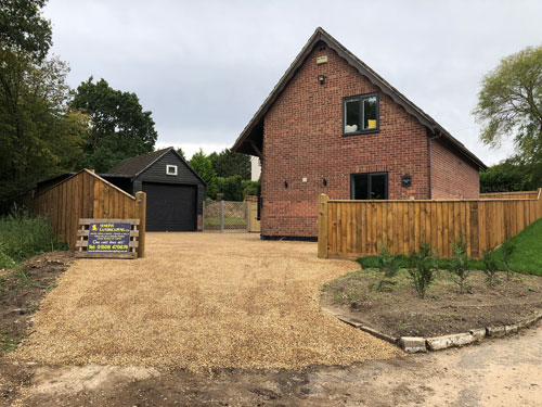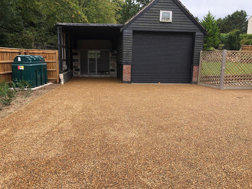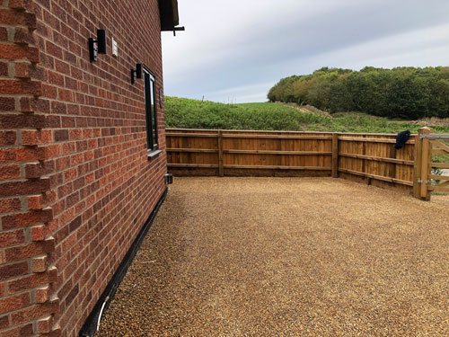 Finally to complete the final part of the project, our team got to work on the driveway area. Once the foundations had been completed, our team then sprayed hot tar over the hole area. Next we laid golden pea shingle on top of the hot tar and finally this was rolled in. This creates the appearance of a golden shingle driveway, without the maintenance of clearing lose shingle.