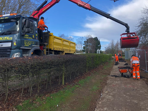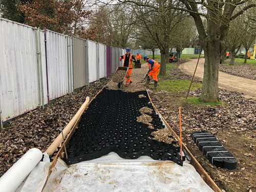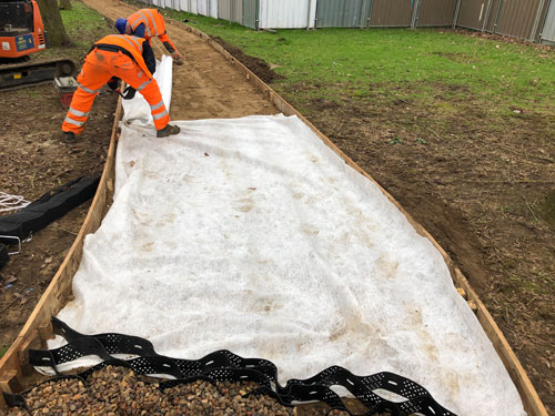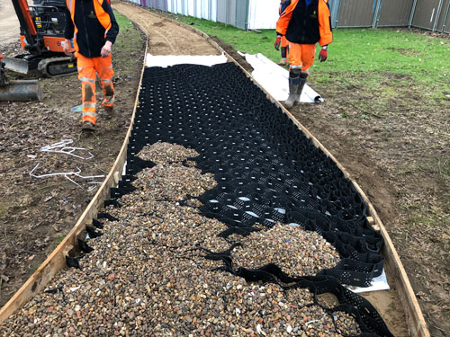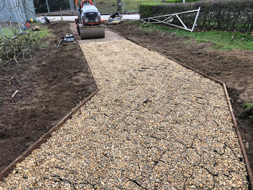 Due to the shallow root structure around the area, our team used an alternative method to create a strong foundation for the pathways. We installed a terram matting at the very base of the pathway, this will prevent weeds from growing through. Our team used a system called cell web which reduce the load to the surface and creates a strong foundation. This was then in filled with 20mm stone and rolled in for compactness.