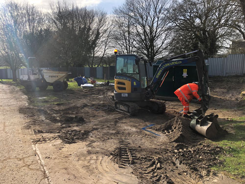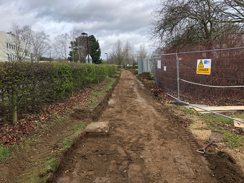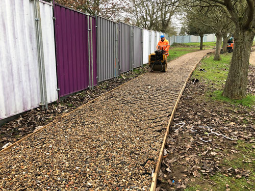 Our clients at the Colney Lane old research centre needed two new pathways to connect the old research buildings. After several site visits and a consultations a quote was drawn up and agreed upon. To start the works our team worked on scraping off the old grass and removed from site. We then installed 150m x 3m wooden gravel boards in which were pegged at every 1 meter.