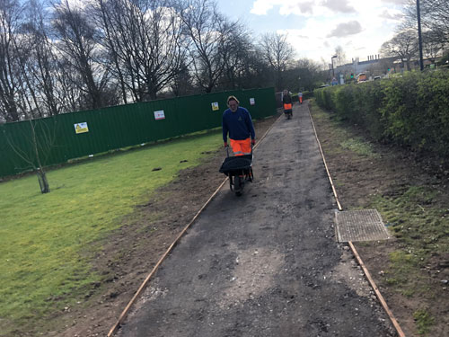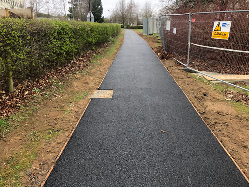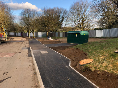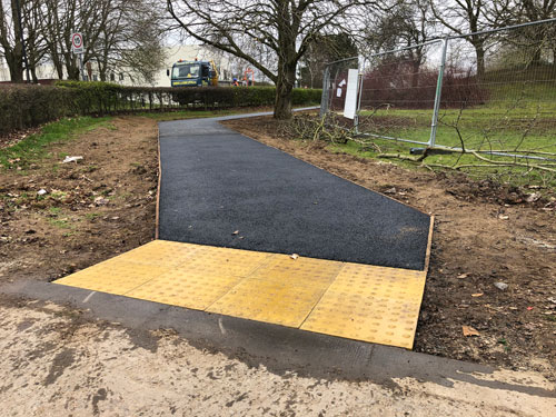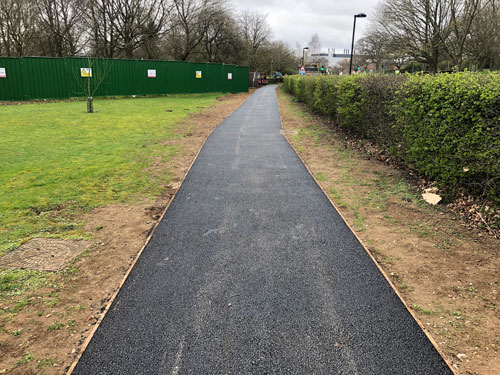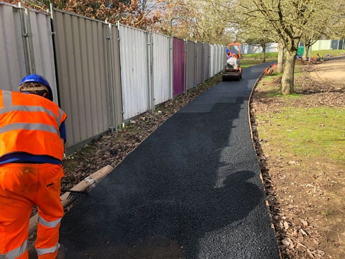 All of the pathways were surfaced in 10mm wearing course tarmac. This was laid on thick at 50mm, rolled on compacted down. This gives the pathway a hard warring surface to be used over many years in the future.