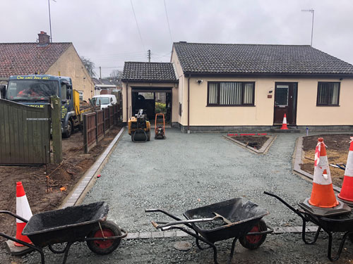 To start this project our team cleared off the old driveway area. We also removed old fencing, hedging, bushes and lawn. All of these were cleared away from site, leaving a fresh canvas for our team to work with. Starting on the driveway our team laid terram matting down at the very base of the driveway, this will prevent weeds to grow through the driveway in the future. The next component for the base of the driveway is type one granite, this was laid on top of the matting and will allow surface water to drain through.