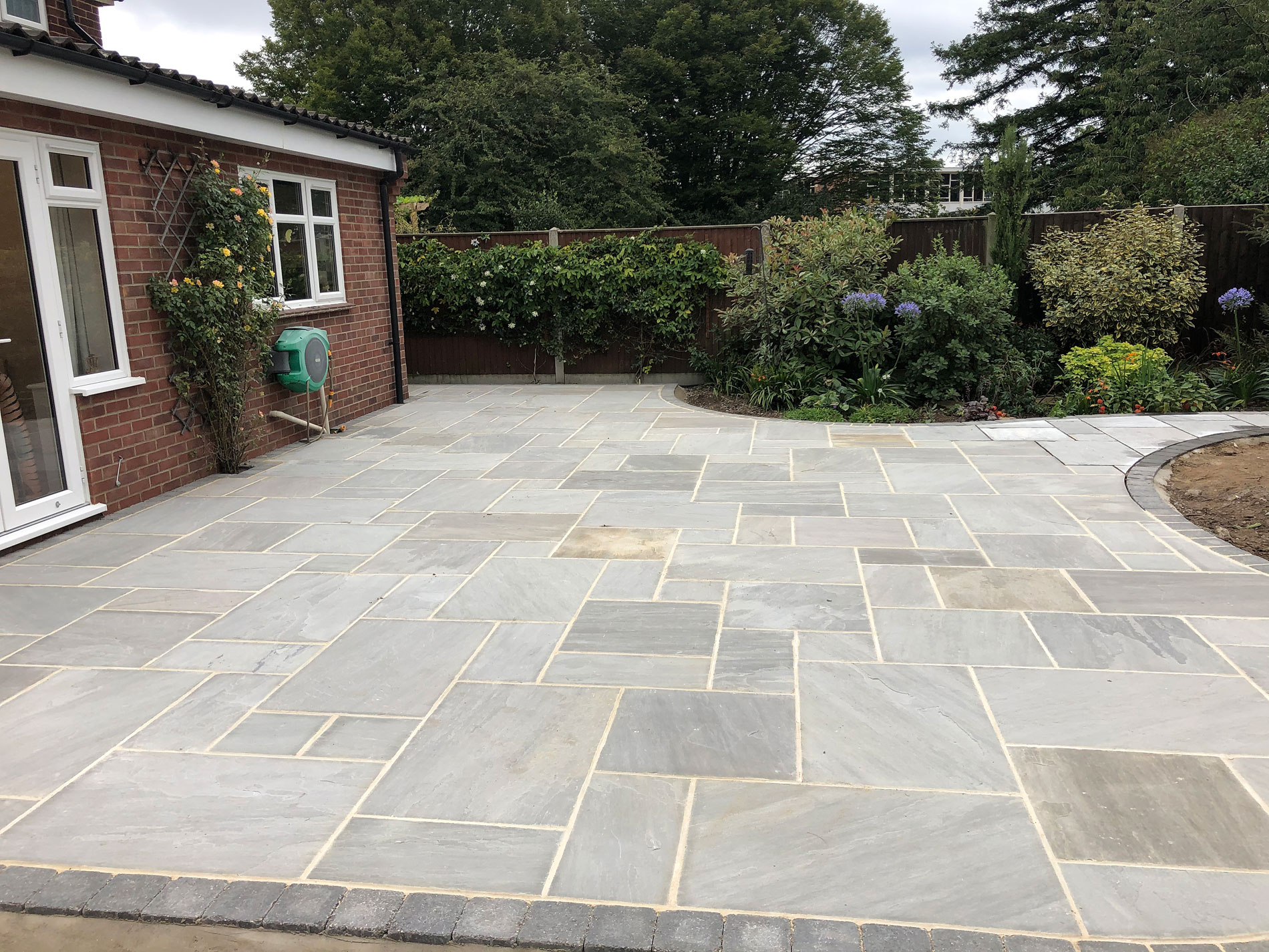 - Grey Indian sandstone patio area with charcoal block edging – Norfolk