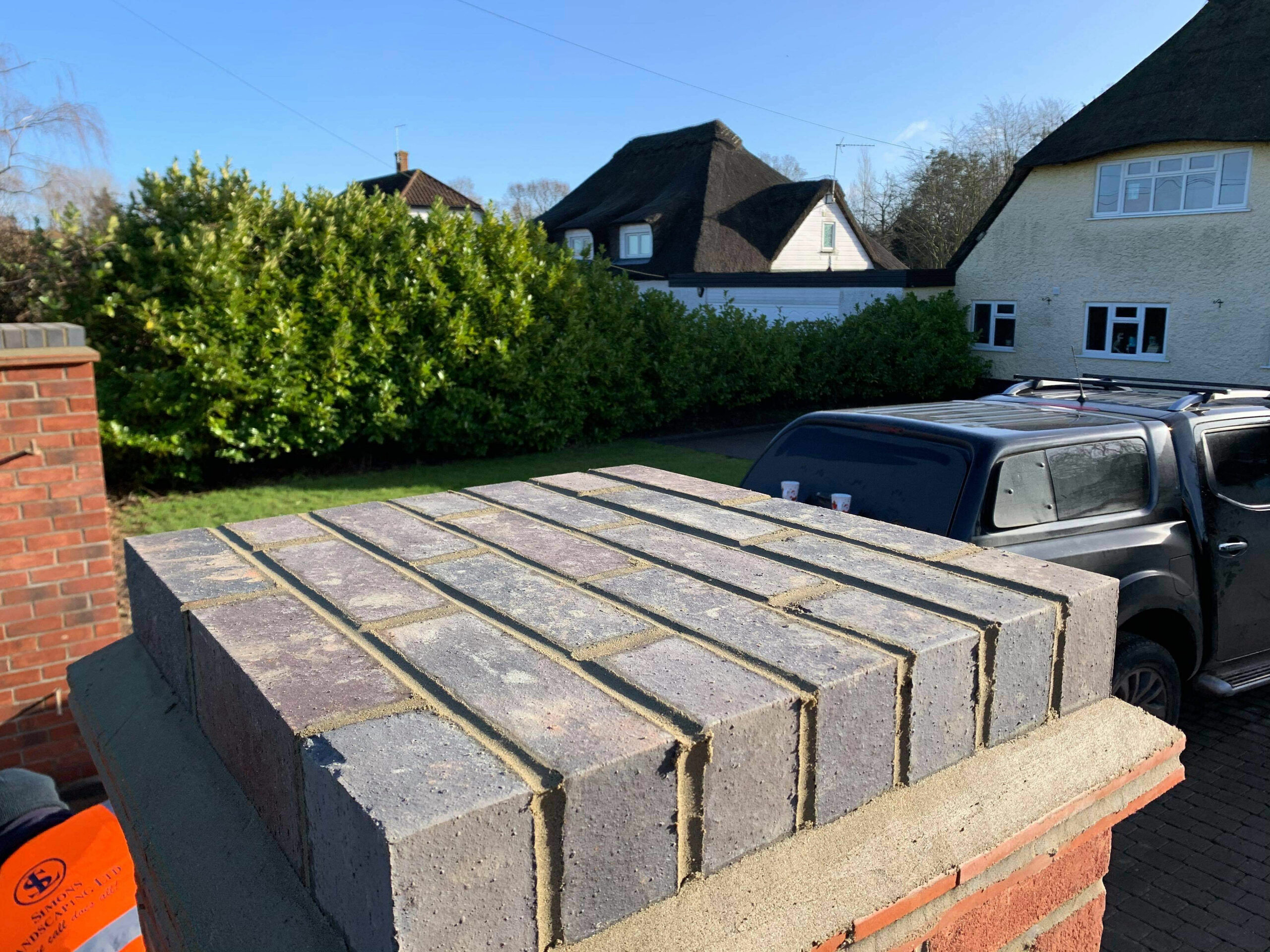 We are currently creating a new entranceway for a customers driveway. The brick pillars were created to hold an entrance gate, which will be installed at a later date. The entrance pillars also have blue engineering bricks on top, also using tile creasing for a decorative finish.