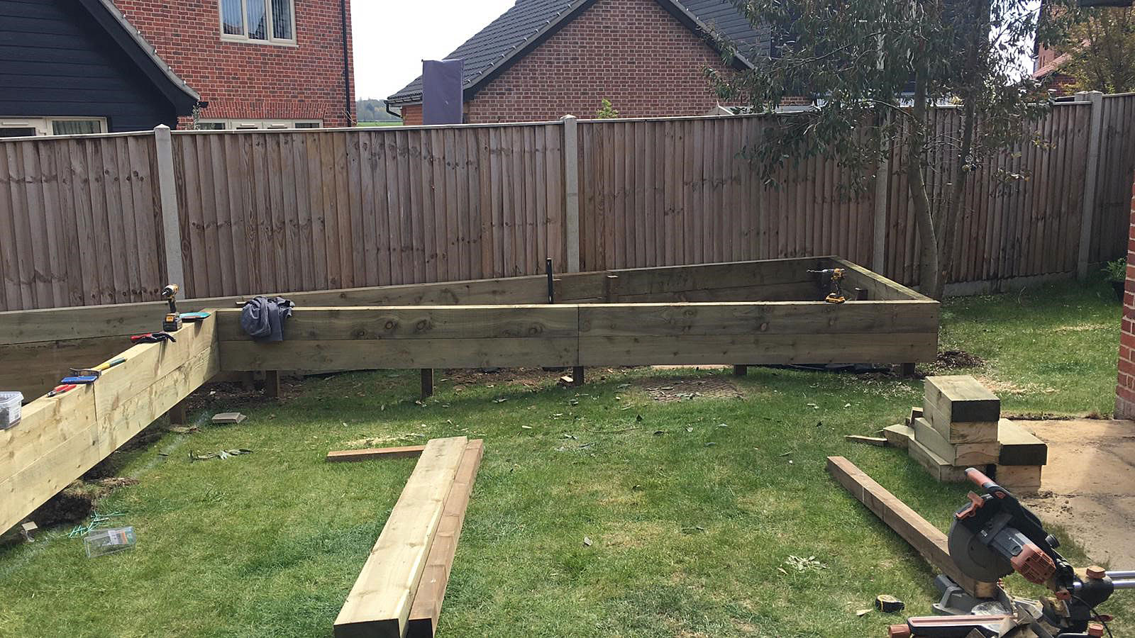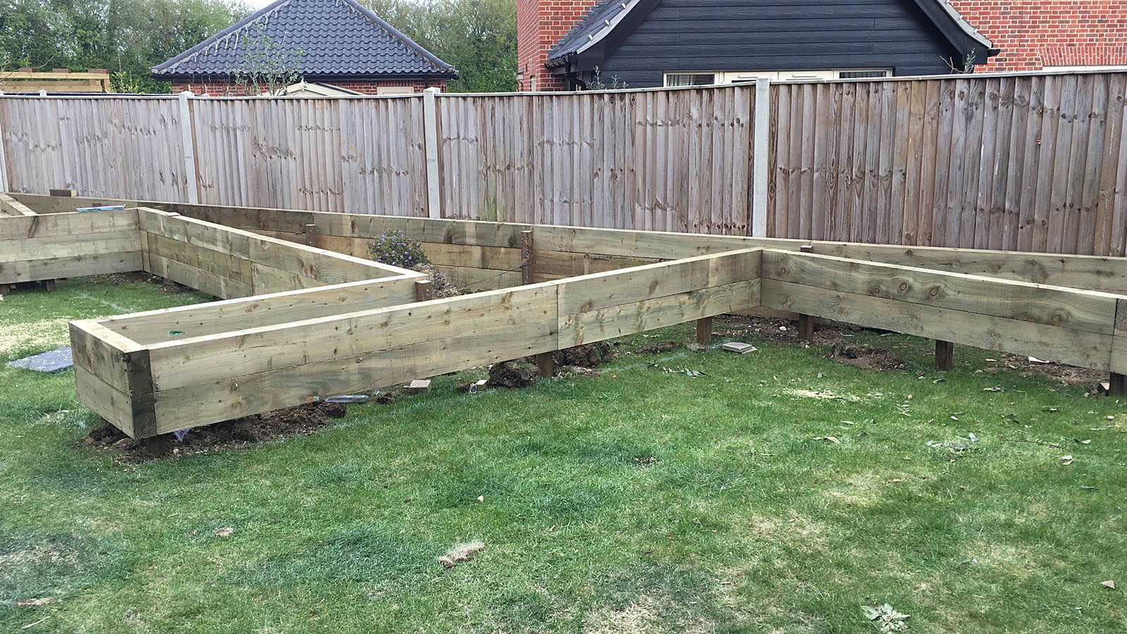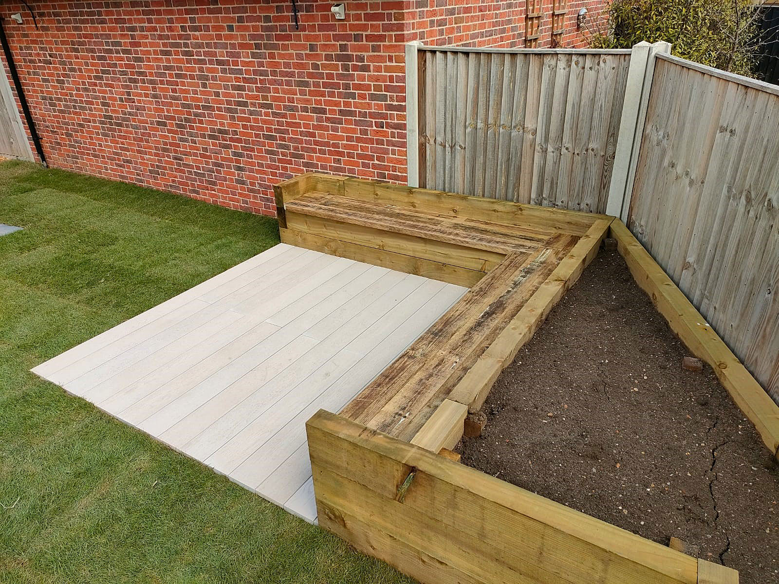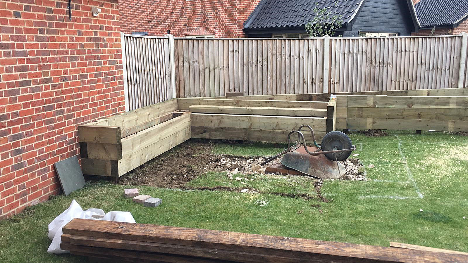 To start of the landscaping works our team created the layout for the garden area and sleeper beds. These were constructed and moved into position, this shows of the outline for the garden area and allows our team to start the foundation of creating the two levelled garden. The sleeper beds were constructed from softwood sleepers and are ideal for this size of works. Working with our client they wanted to incorporate a seating area in one of the sleeper bed areas.