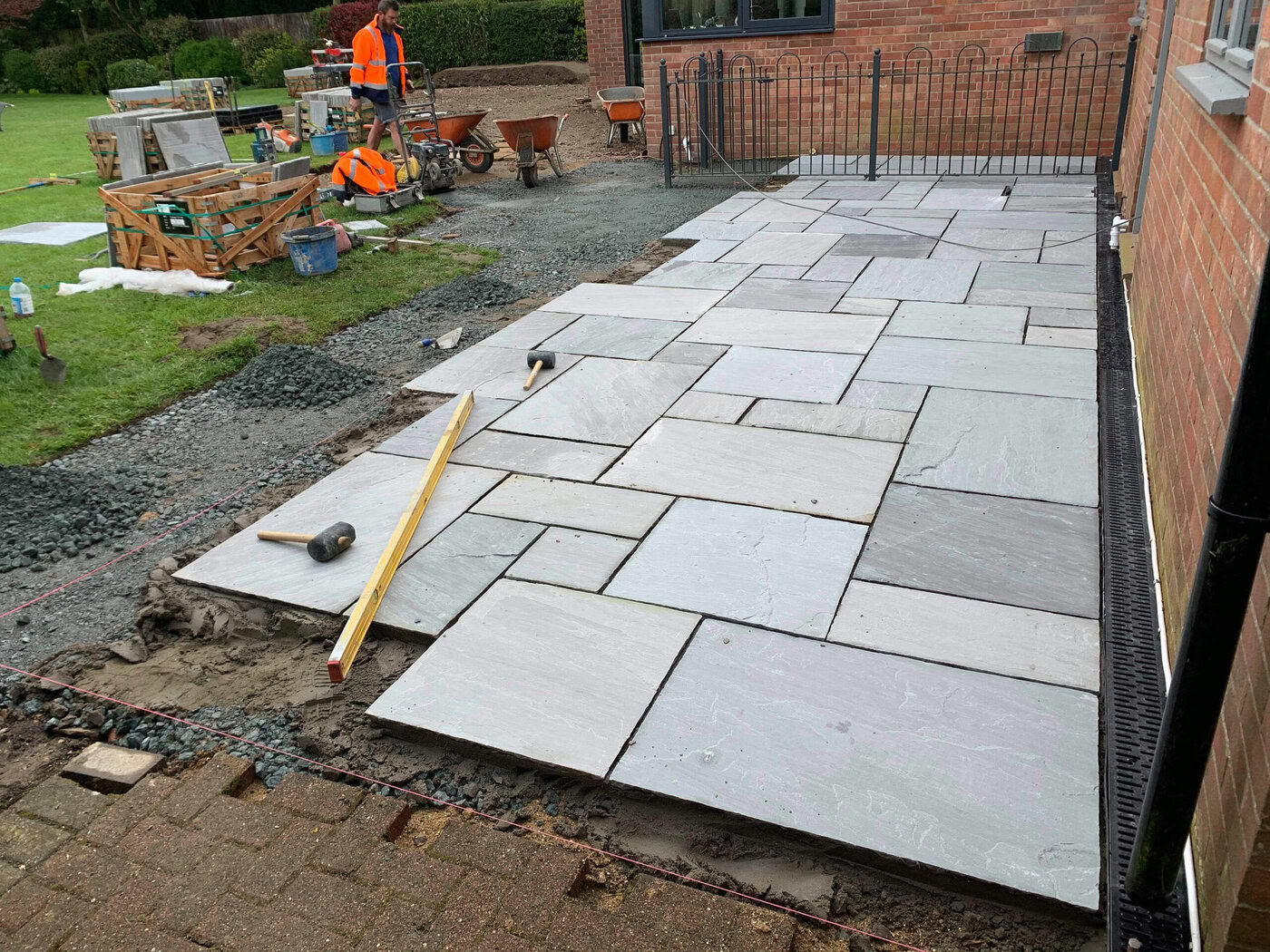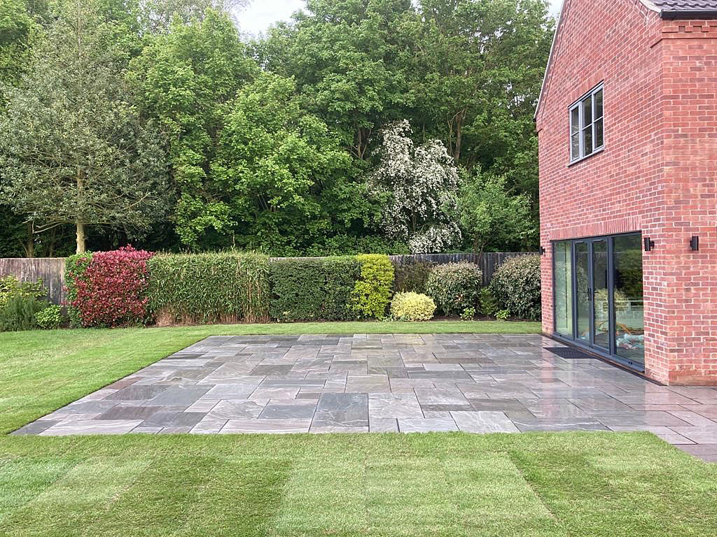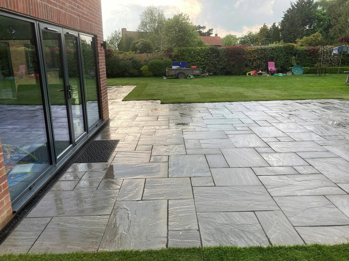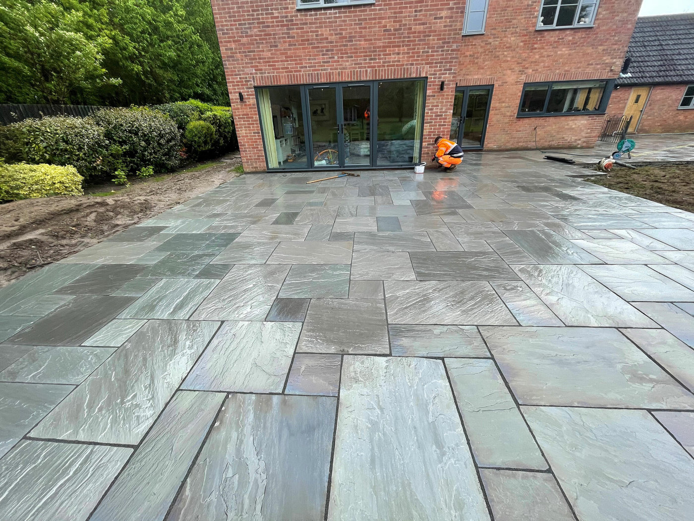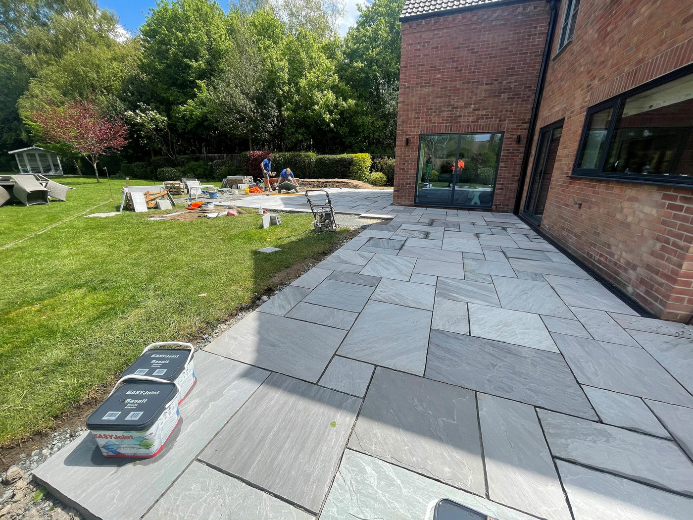 Our team got to work on installing the patio work in which was completed in stages around the rear of the property. The team also installed a matching pathway down the side of the house using the Grey Indian sandstone slabs. Once the patio area has been laid the final part is to finish of grouting the patio area to create a complete seal to the elements. We use an easy joint grey grout to match the colour of the Indian sandstone slabs.
