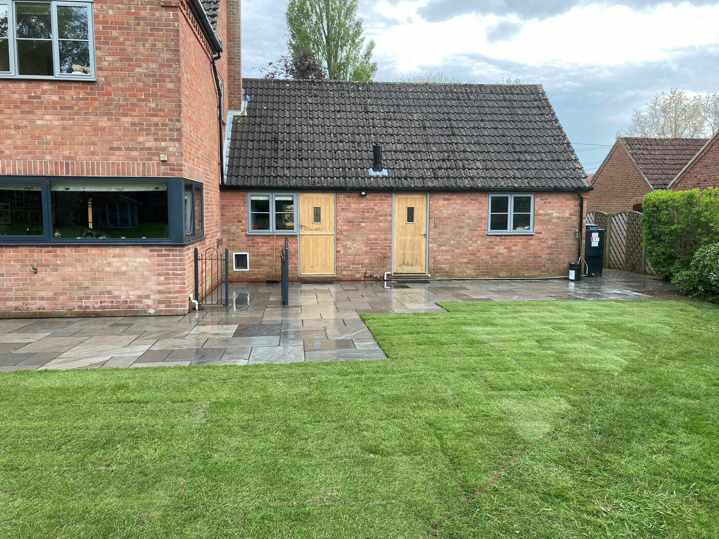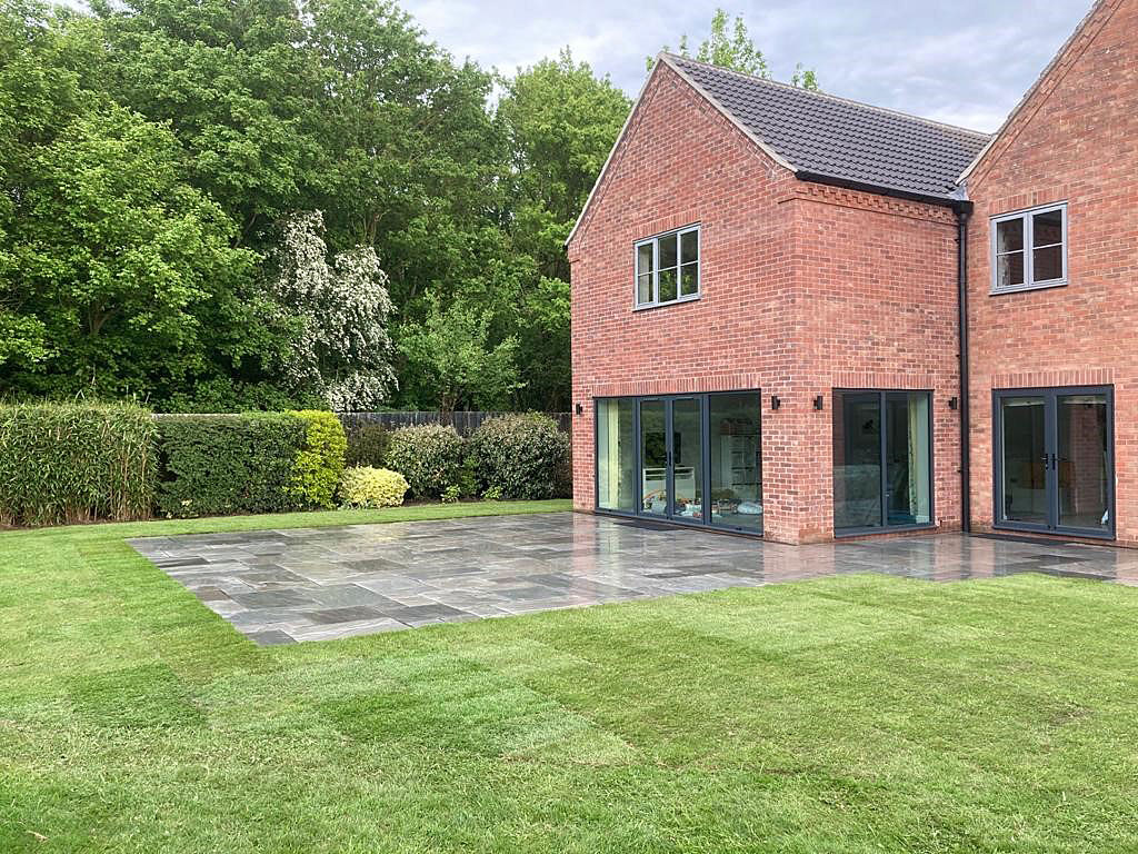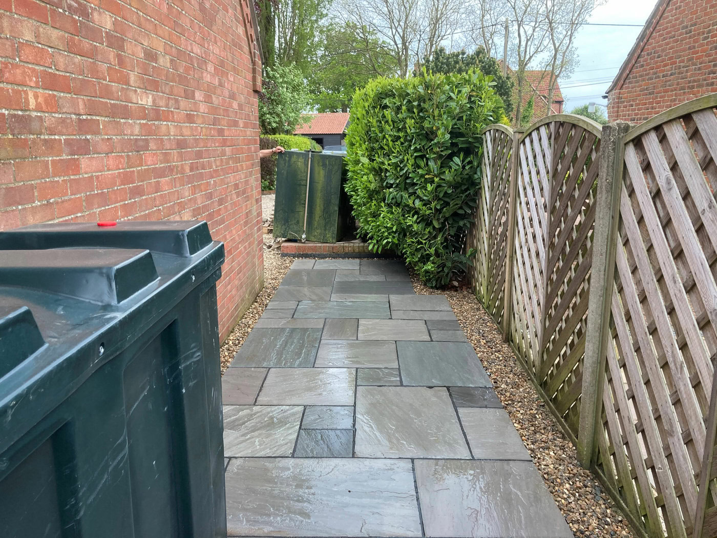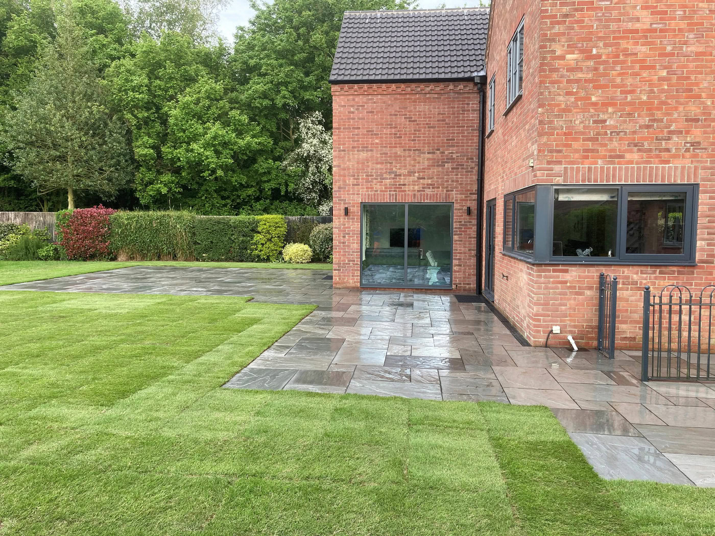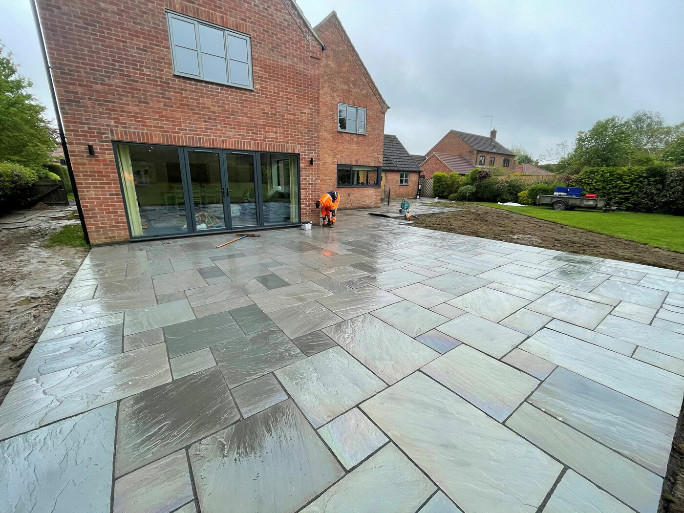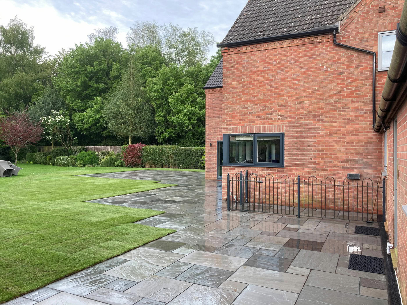 Our team got to work on installing the patio work in which was completed in stages around the rear of the property. The team also installed a matching pathway down the side of the house using the Grey Indian sandstone slabs. Once the patio area has been laid the final part is to finish of grouting the patio area to create a complete seal to the elements. We use an easy joint grey grout to match the colour of the Indian sandstone slabs.