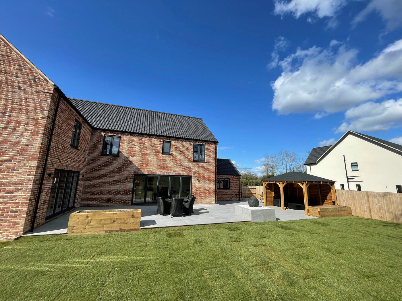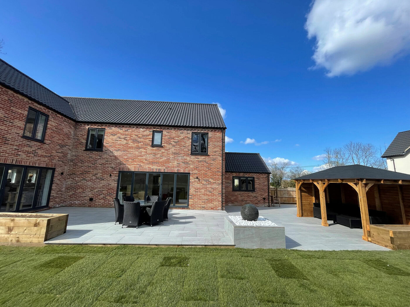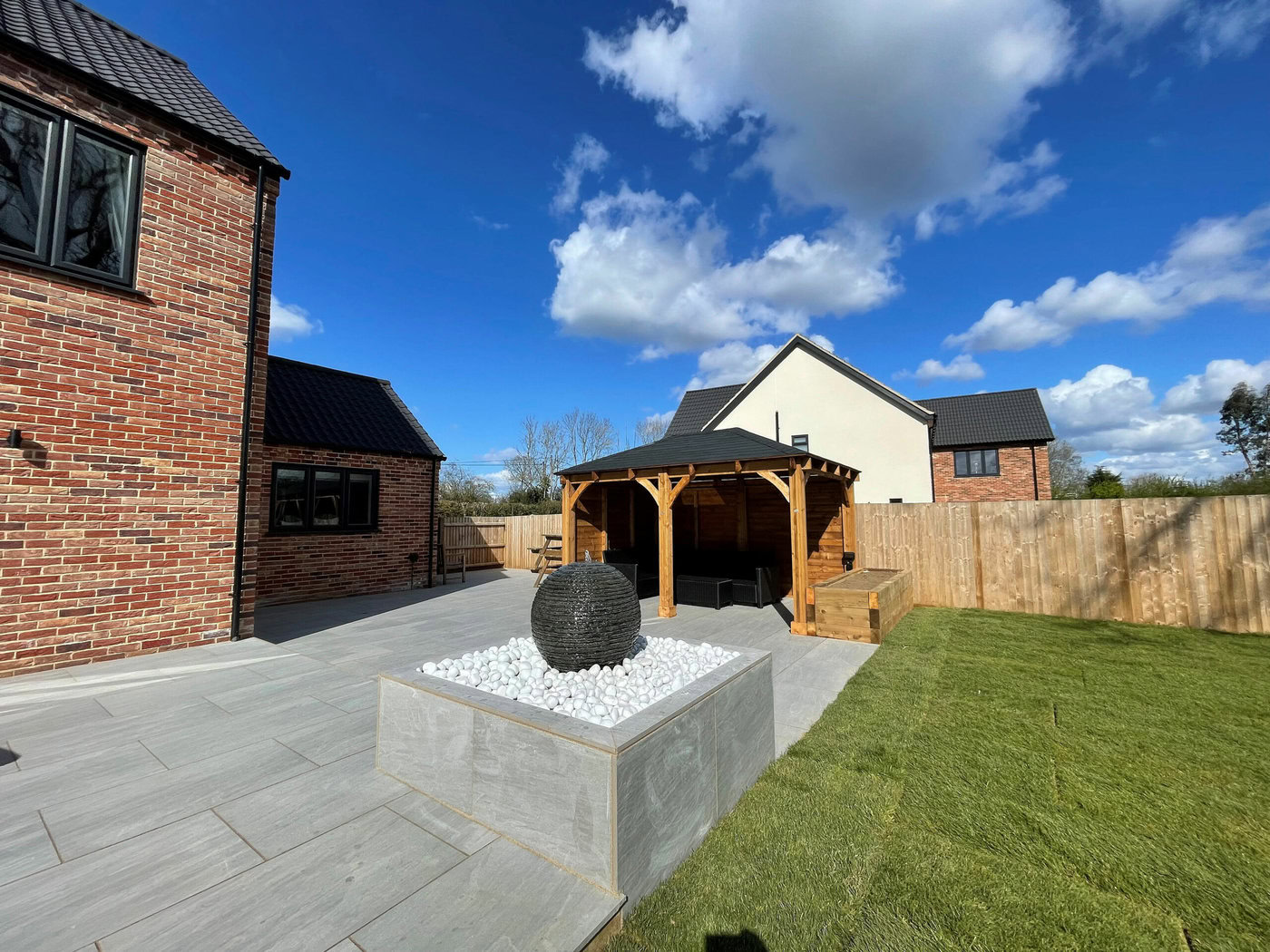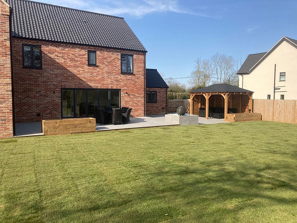 As the weather starts to heat up a lot of people start to picture how they want their gardens to look in the summer. Our customer over in Beeston, Norfolk had a clear vision as to what they wanted to achieve with their garden area. The brief was very simple, a large patio area, a specific water feature, a gazebo area, a driveway extension and to finish with a topping of turf. The project started on the 1st of March and was finished on the 1st of April; finishing as a four week project.