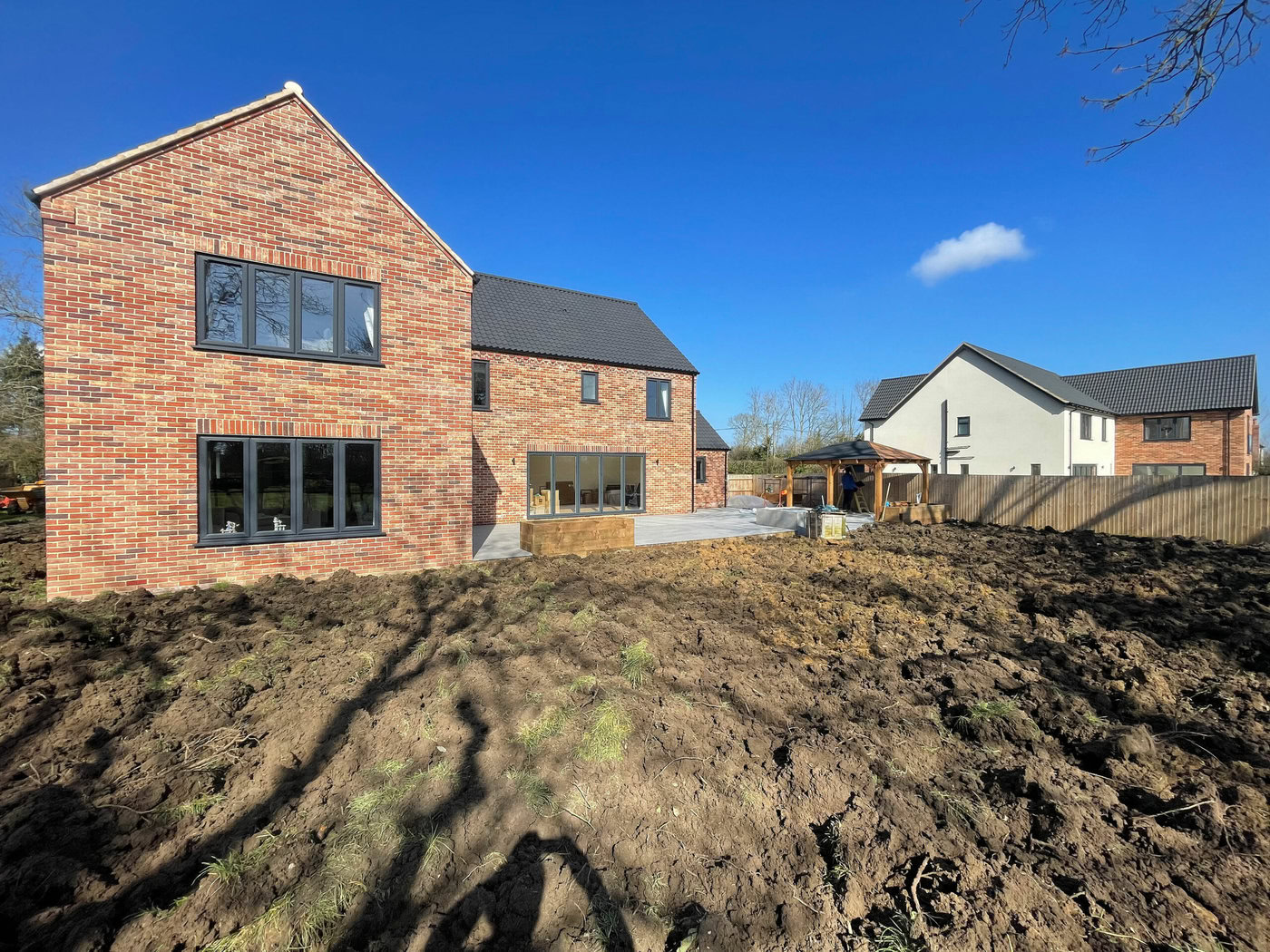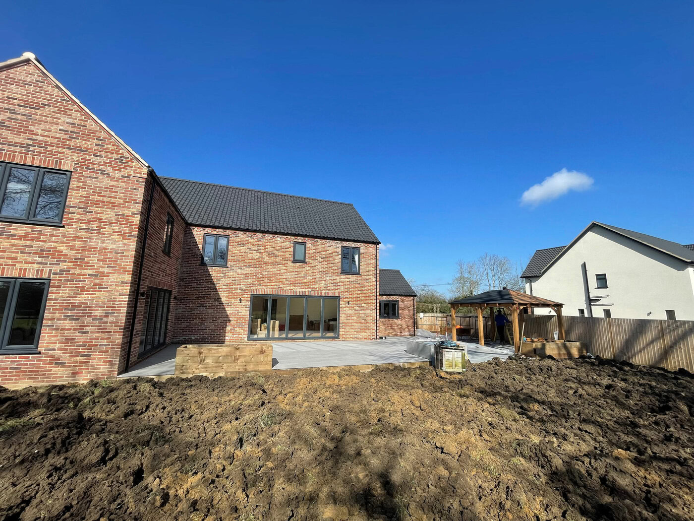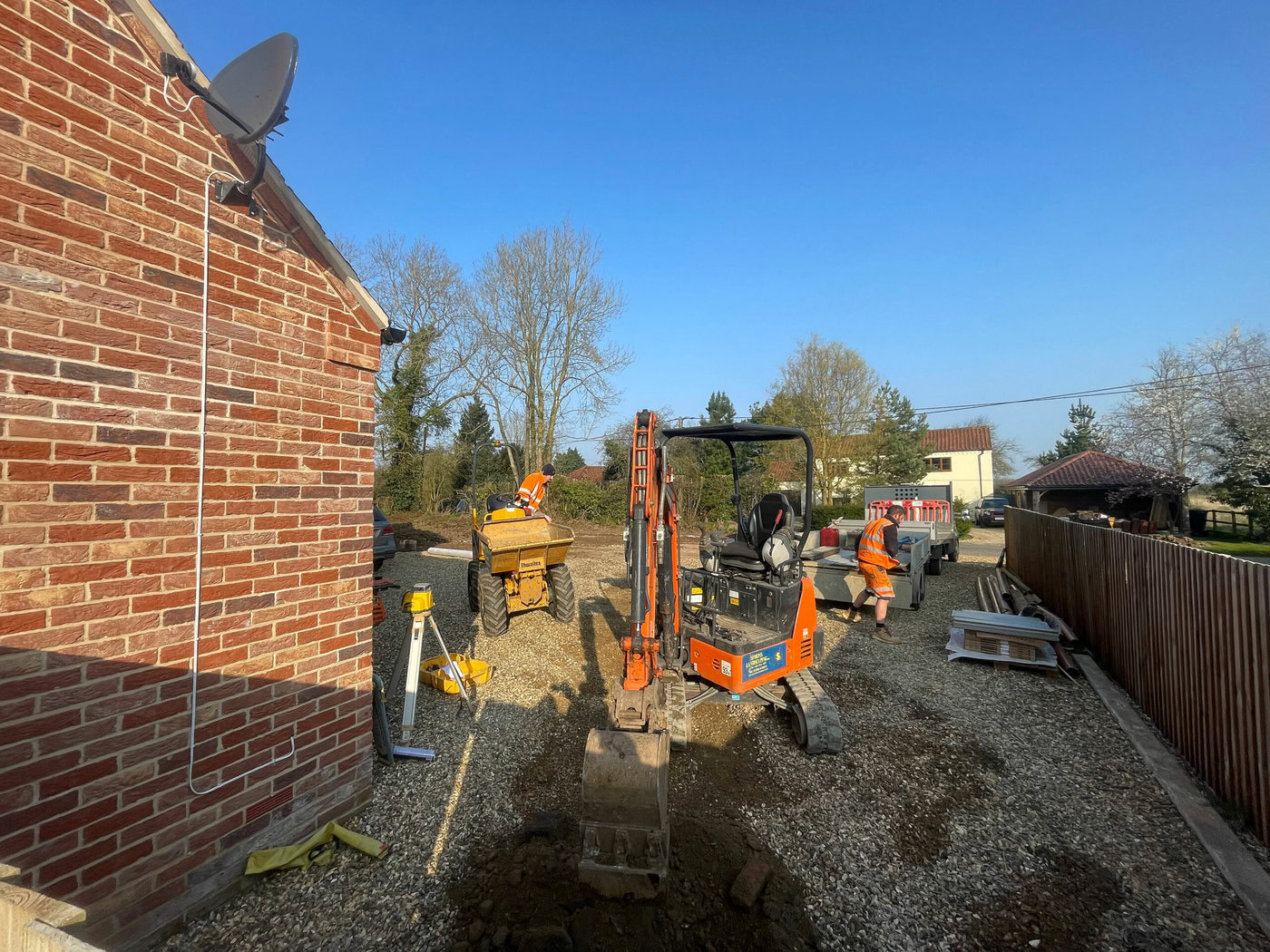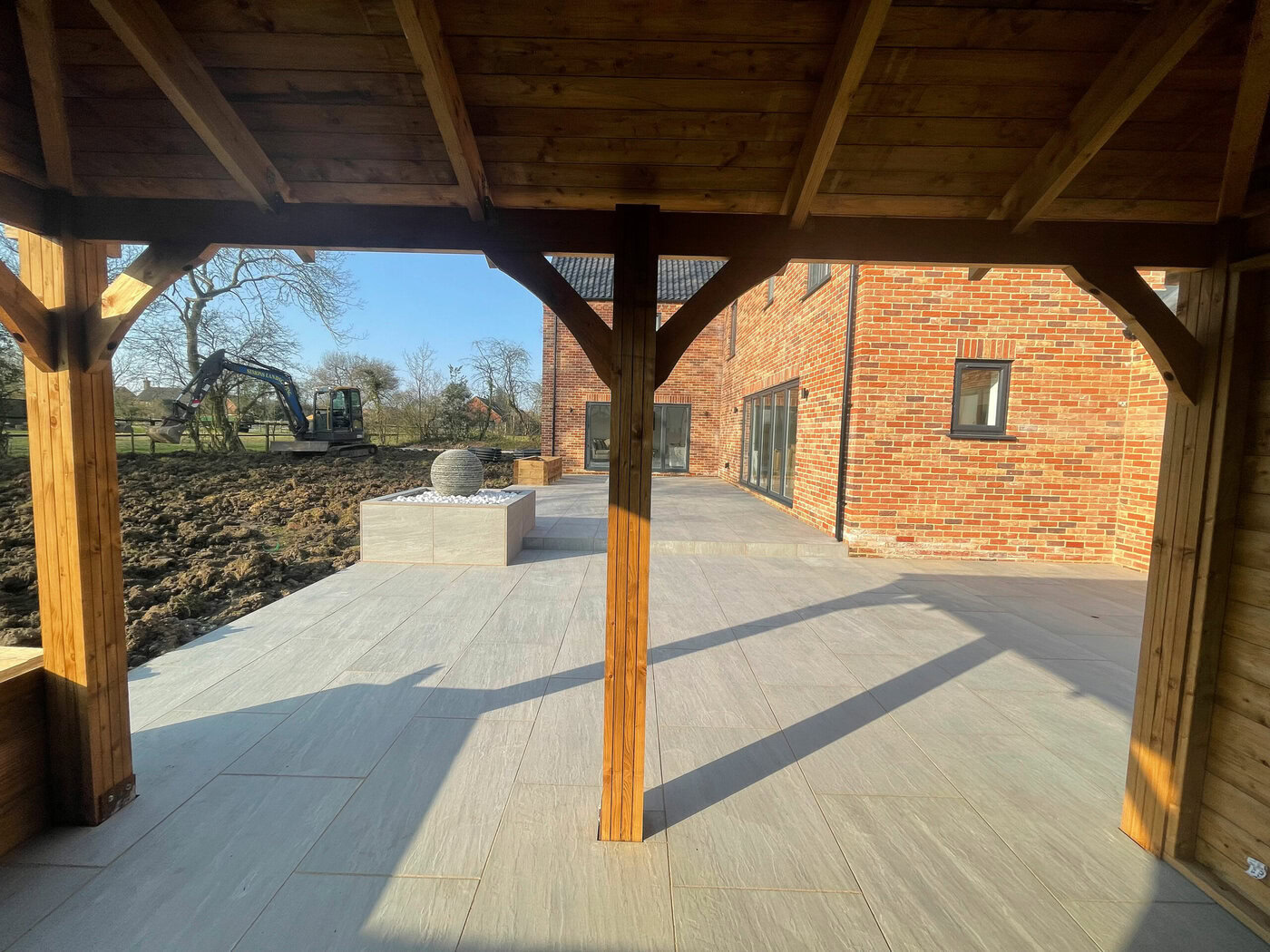 As the weather starts to heat up a lot of people start to picture how they want their gardens to look in the summer. Our customer over in Beeston, Norfolk had a clear vision as to what they wanted to achieve with their garden area. The brief was very simple, a large patio area, a specific water feature, a gazebo area, a driveway extension and to finish with a topping of turf. The project started on the 1st of March and was finished on the 1st of April; finishing as a four week project.