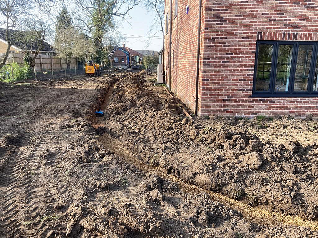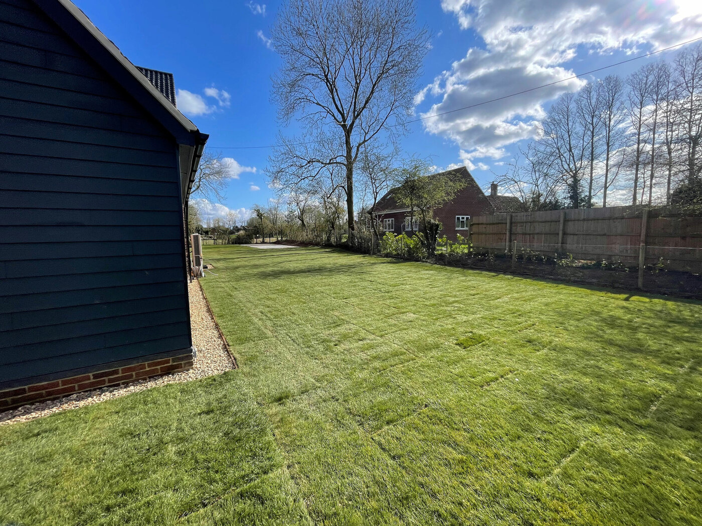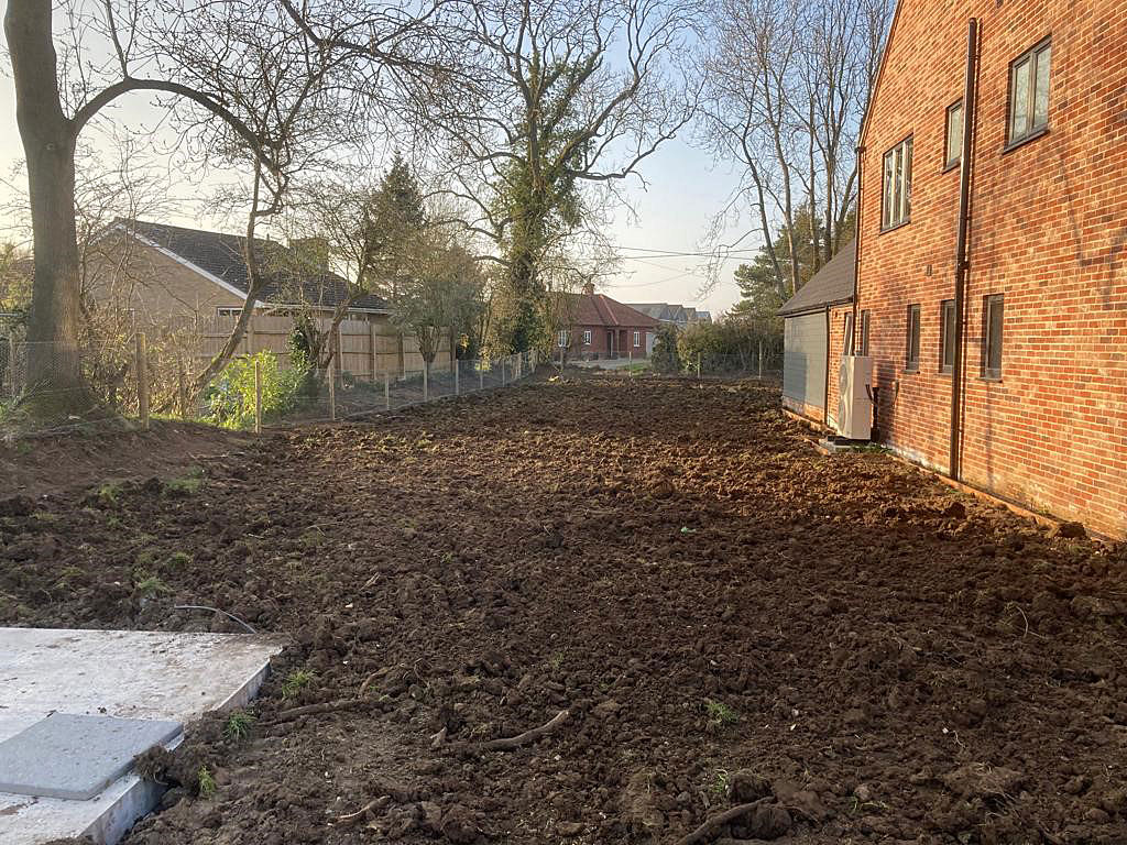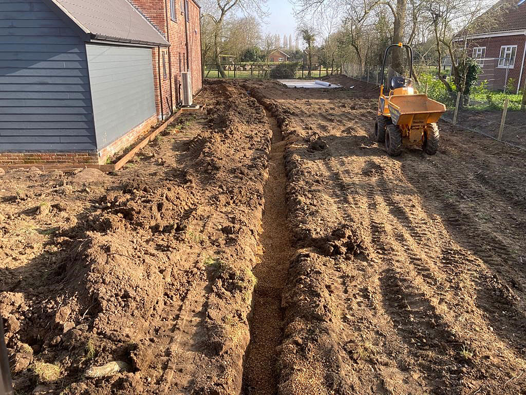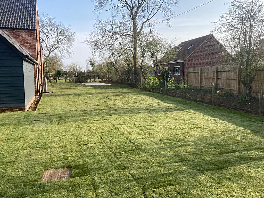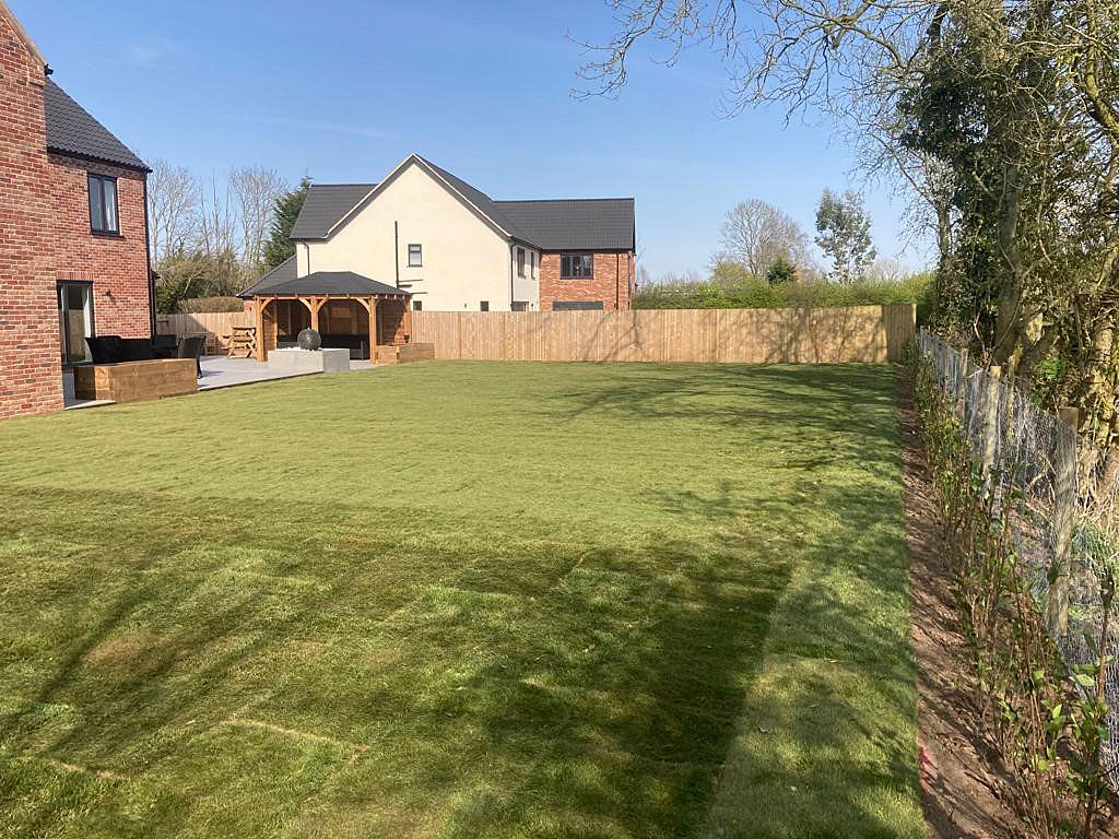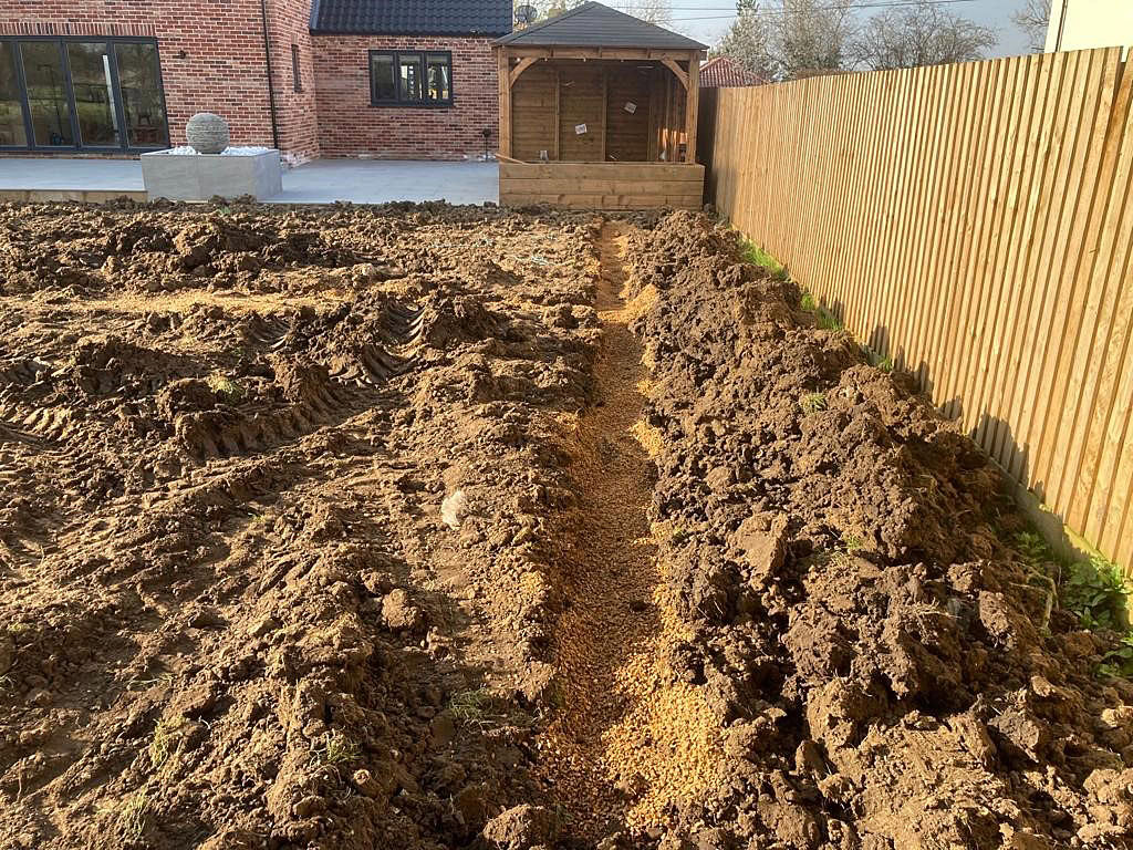 Due to being heavy cropped soil and being quite dense, this wasn’t suitable for our team to start working with. We dug over the whole soil area to create aeration and drainage. The next task was to create the drainage channels through the garden for the French drain system. These were positioned leading to passing ditches for a clear water flow. Next we prepared and levelled the soil with additional landscape top soil; ready for a turf topping. Finally we installed shingle drainage edge around the perimeter of the house. This will keep grass and soil away from the house and adds more characteristic detail and look for the project.