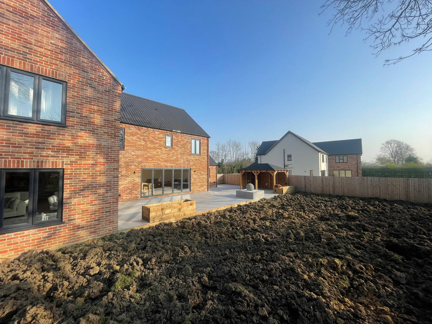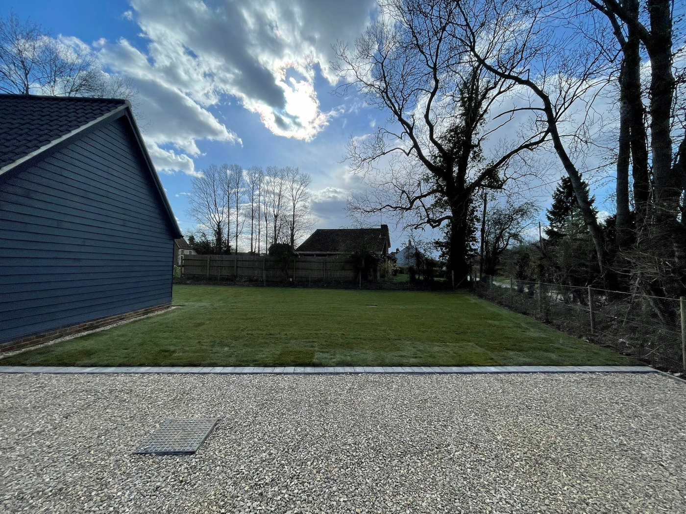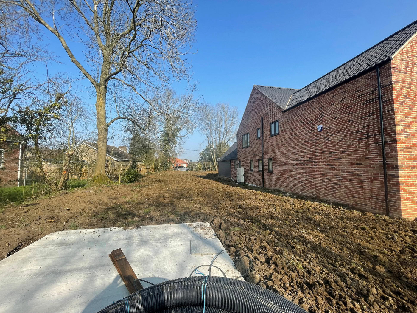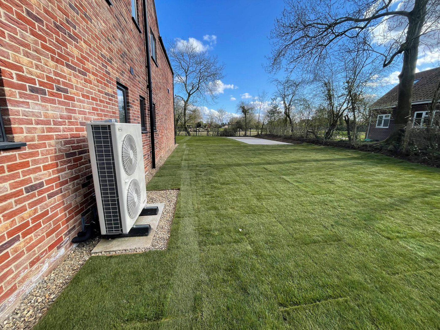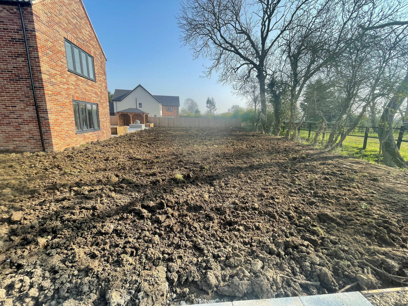Due to being heavy cropped soil and being quite dense, this wasn’t suitable for our team to start working with. We dug over the whole soil area to create aeration and drainage. The next task was to create the drainage channels through the garden for the French drain system. These were positioned leading to passing ditches for a clear water flow. Next we prepared and levelled the soil with additional landscape top soil; ready for a turf topping. Finally we installed shingle drainage edge around the perimeter of the house. This will keep grass and soil away from the house and adds more characteristic detail and look for the project.
