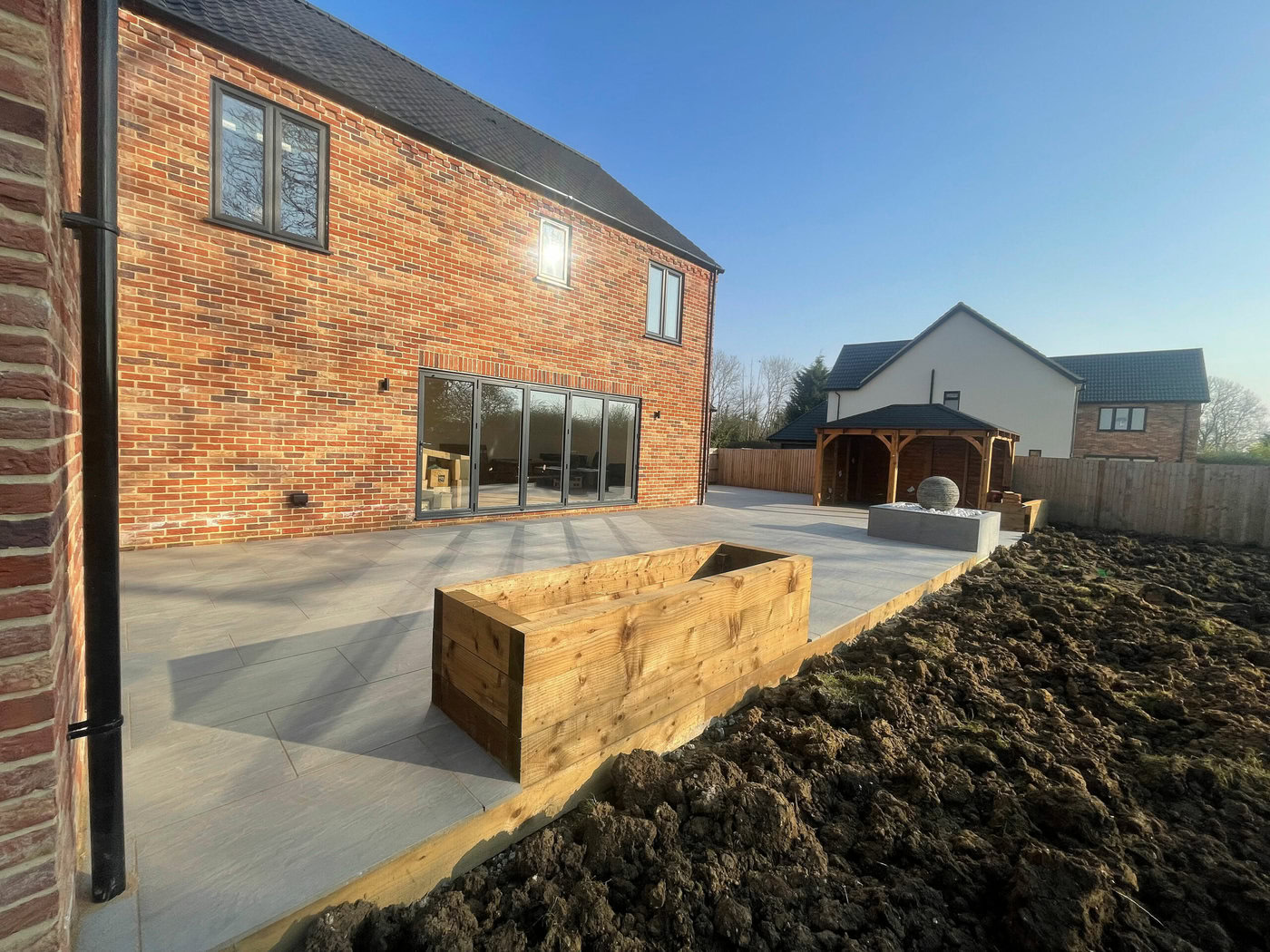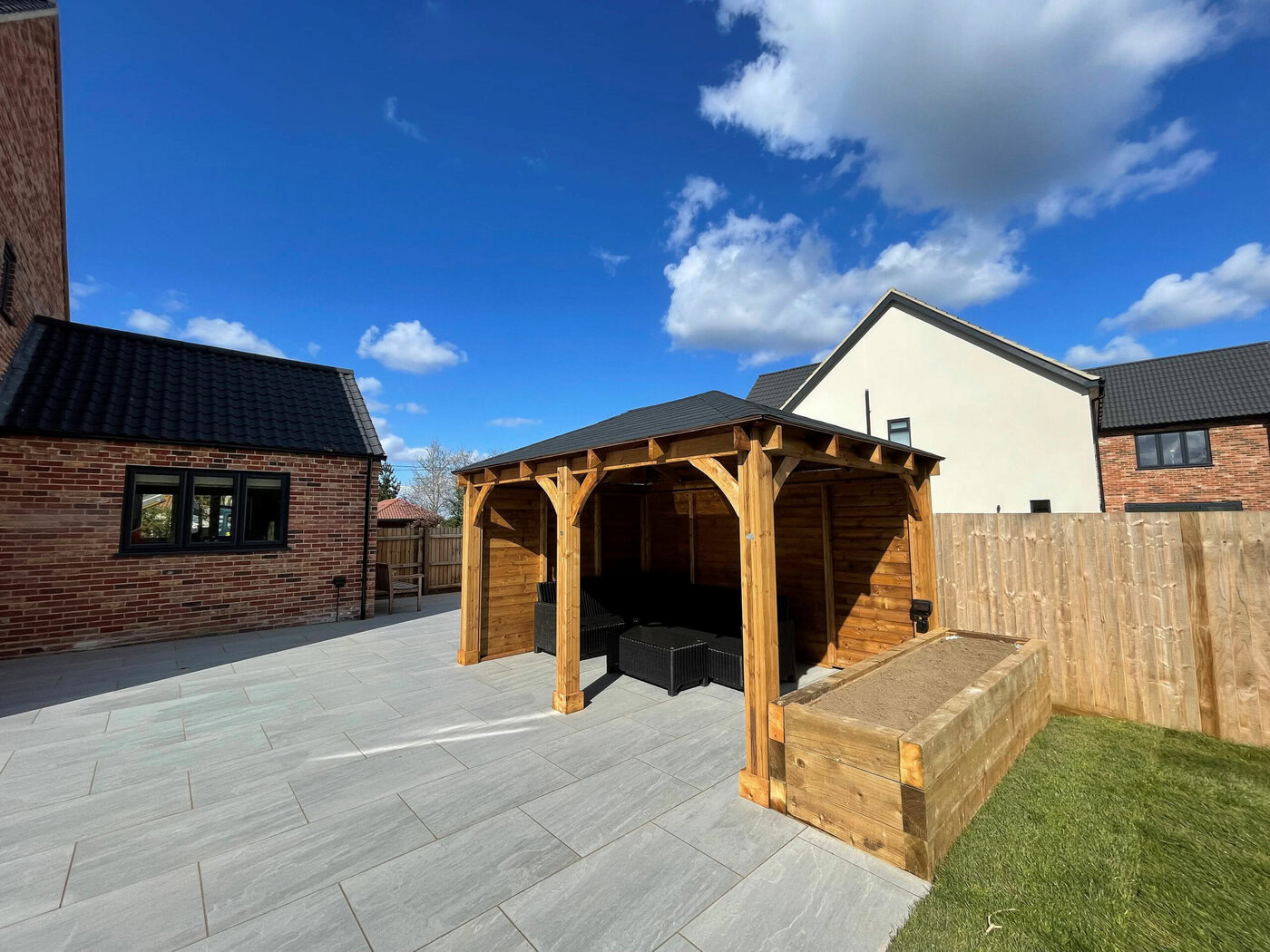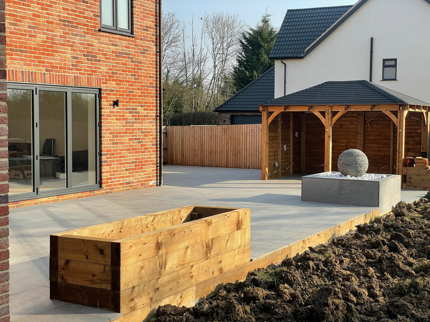Once the patio area had been finished the team then moved onto the finishing articles for the patio. The first entails a six post wooden gazebo which is designed to provide the perfect area for a garden, come rain or shine. This focal point is ideal for parties but equally acts as a cover for barbeques, garden furniture as well as hot tubs. Finally our team moved onto constructing the softwood sleeper beds around the edge of the patio area; all of which had fresh top soil imported into them.