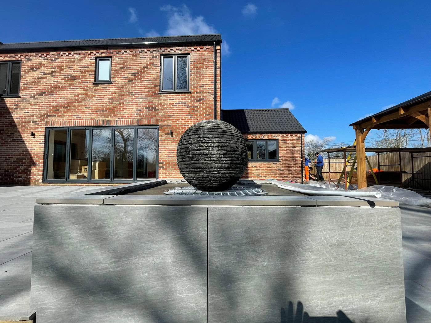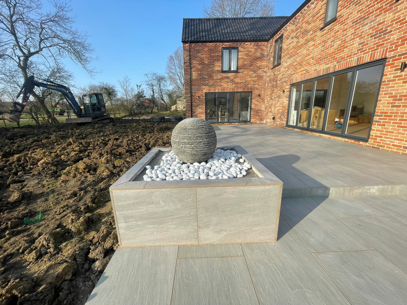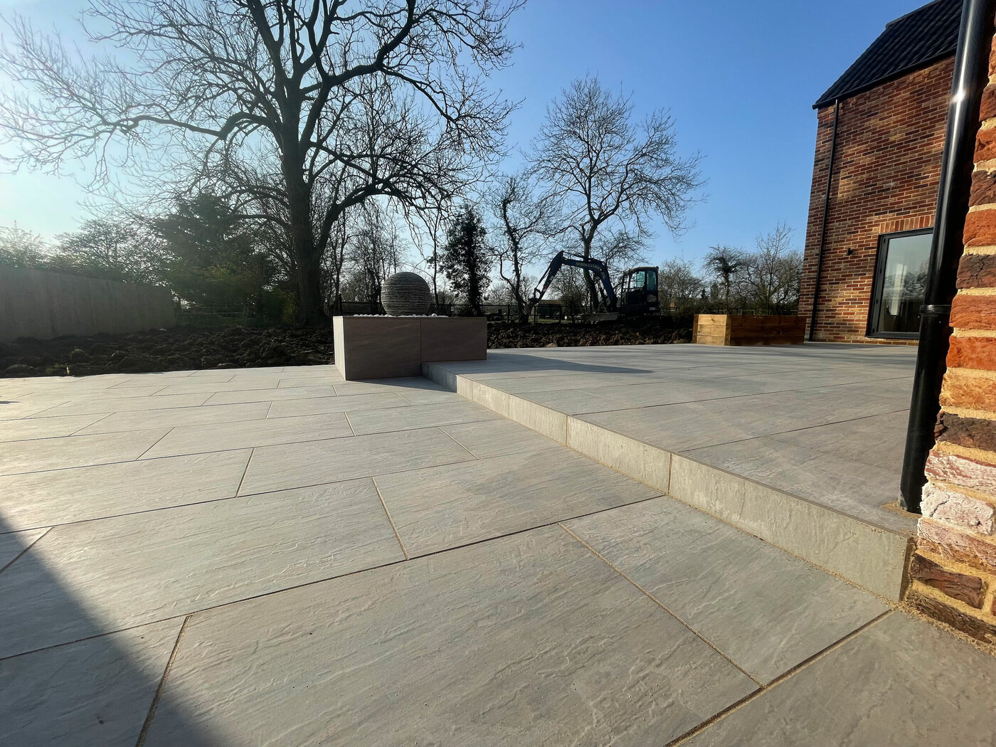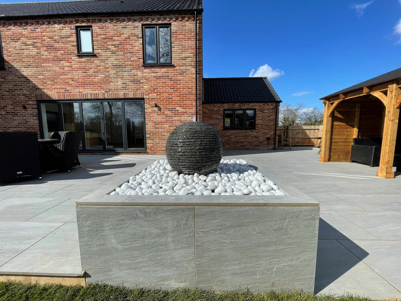 The first area our team started to work on was the patio area, and digging out the whole of the pre-existing area. We then had to lay new type 1 base to prepare split level of the patio area; this provided the final shape for the patio. Once this was finished our team got to work on the concrete block water feature. This was then cladded with porcelain tiles and then topped with a sphere water feature, which allows the water feature to match the patio perfectly and creates the stunning centre piece. The water feature made up of individual layers of slate crafted and shaped to produce the Belmont layered slate spheres in a variety of sizes. Different hues and textures are highlighted by water cascading over the peaks and troughs of the stone.