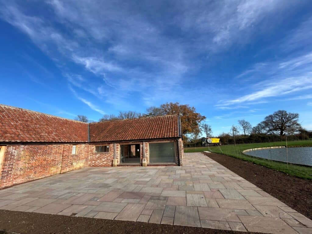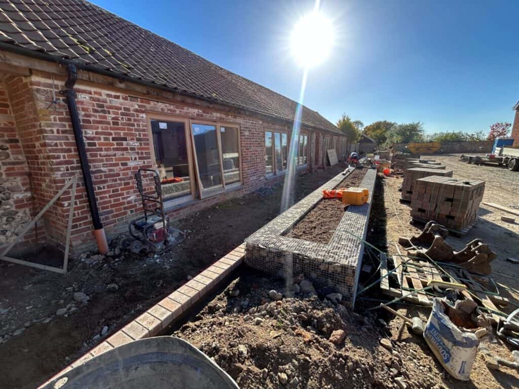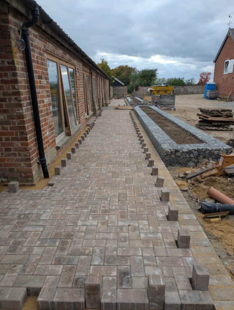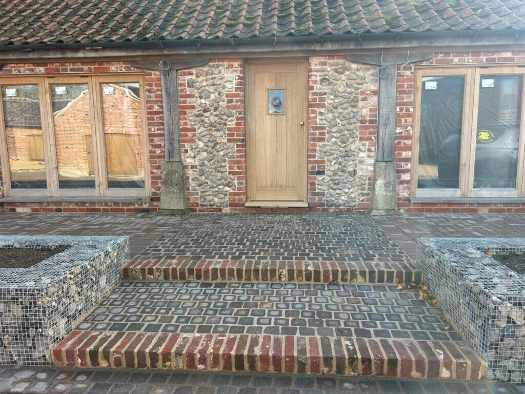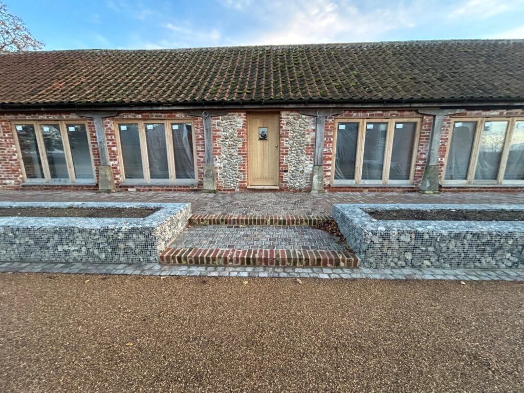 Moving to the next stage a brick weaved pathway has been laid the full length of the barn with a split in materials and step leading to the front door entrance using granite sets which blend well with the flint gabions.