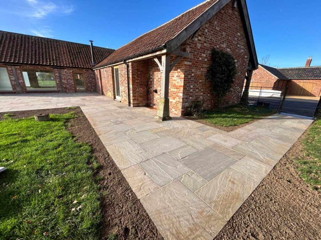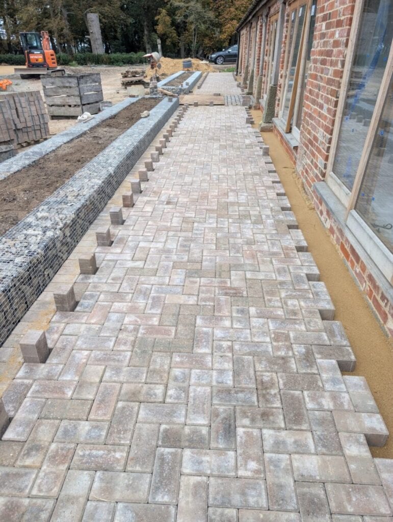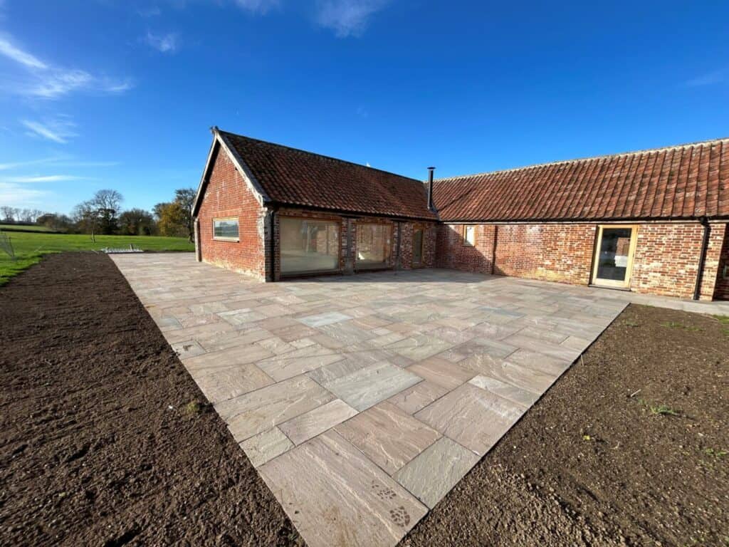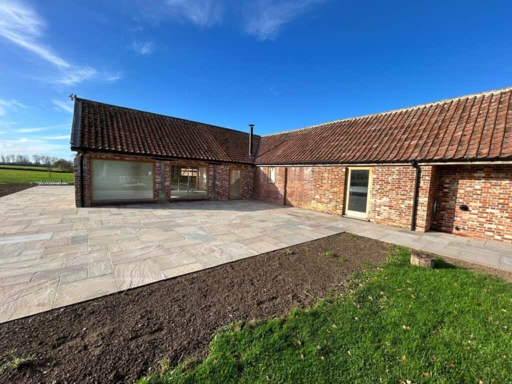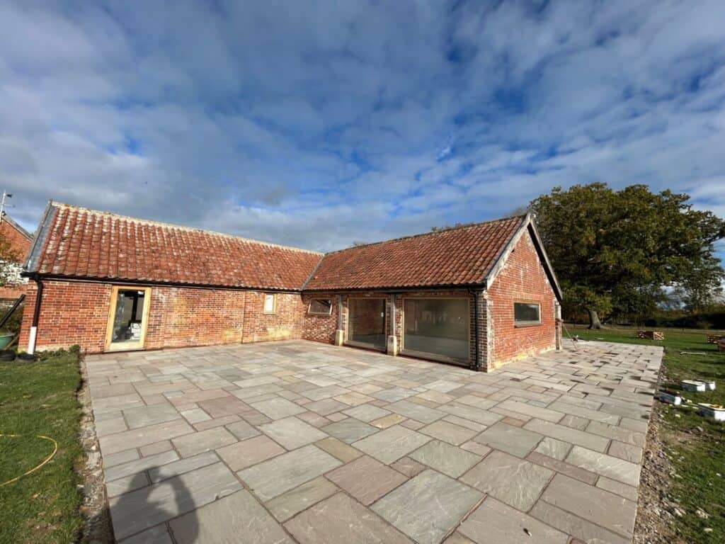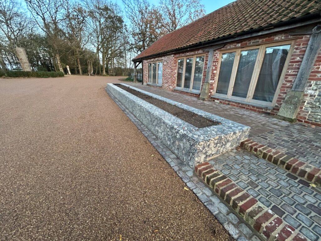Moving to the next stage a brick weaved pathway has been laid the full length of the barn with a split in materials and step leading to the front door entrance using granite sets which blend well with the flint gabions.