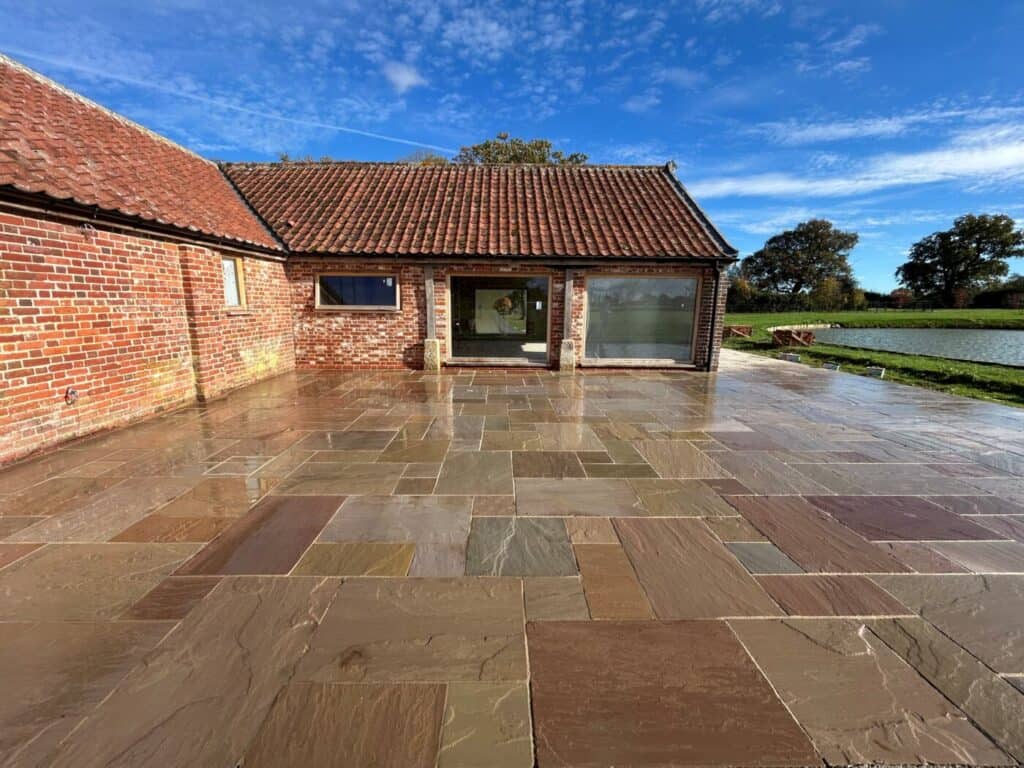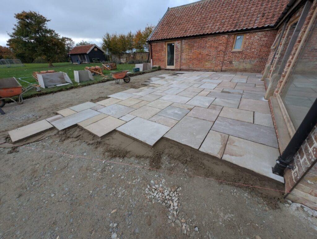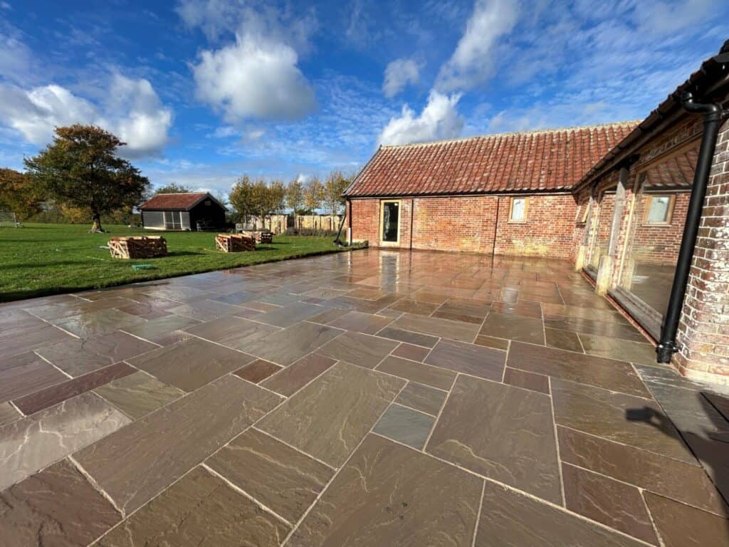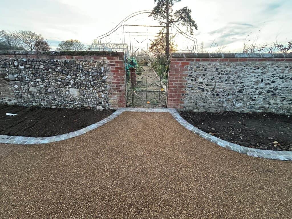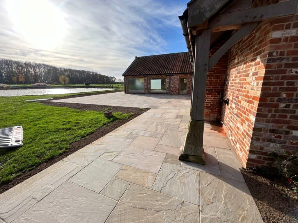 Moving to the next stage a brick weaved pathway has been laid the full length of the barn with a split in materials and step leading to the front door entrance using granite sets which blend well with the flint gabions.