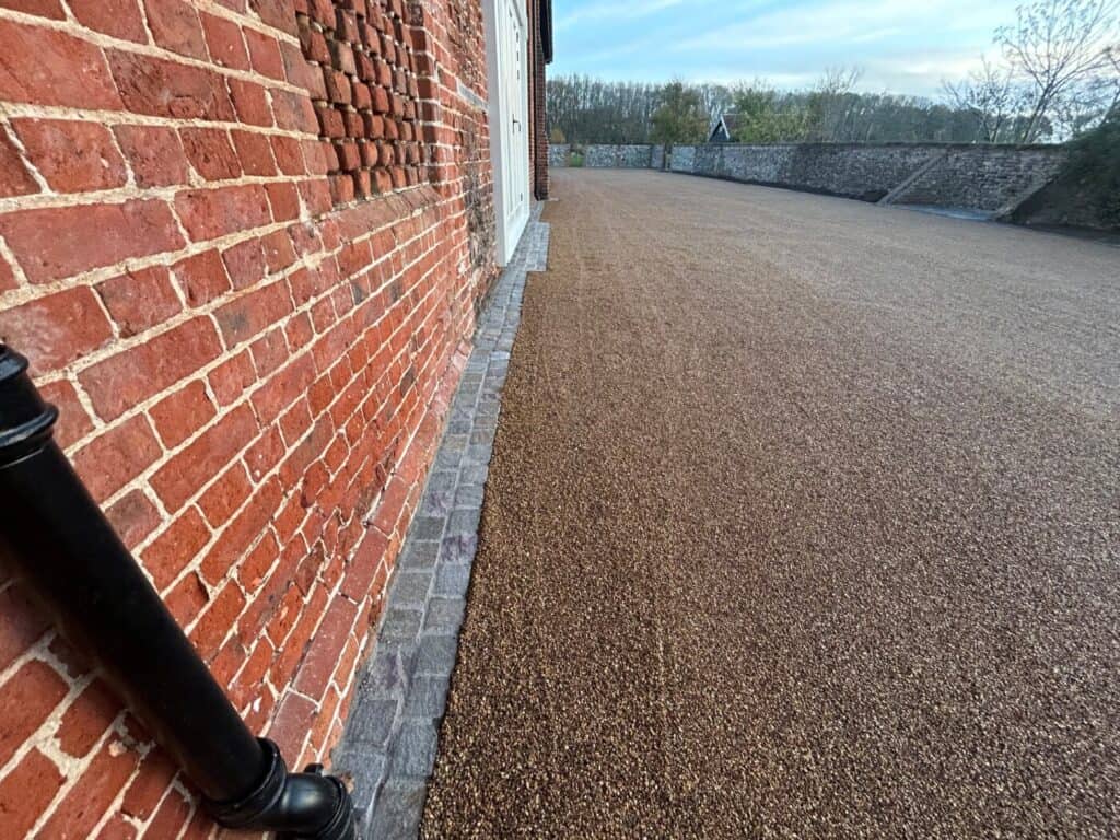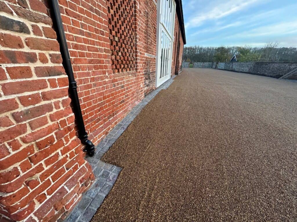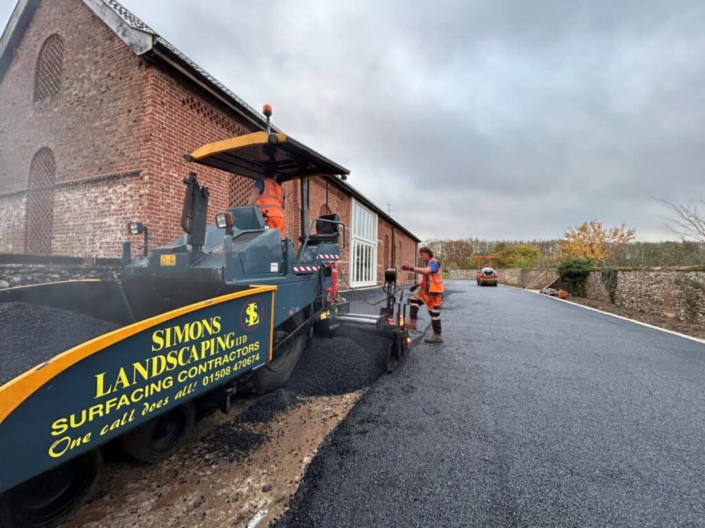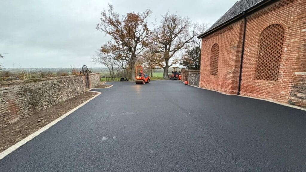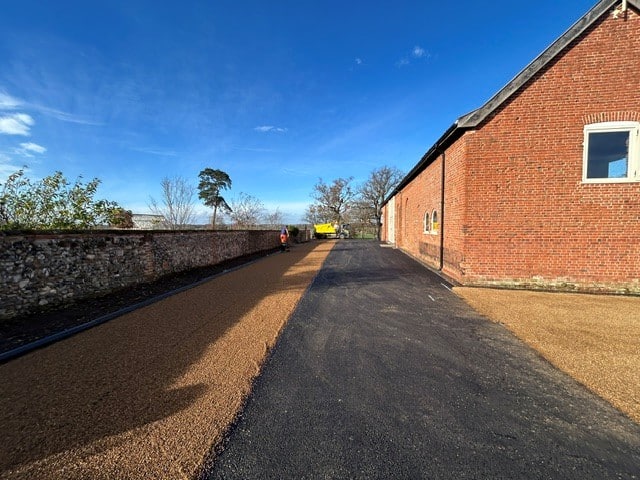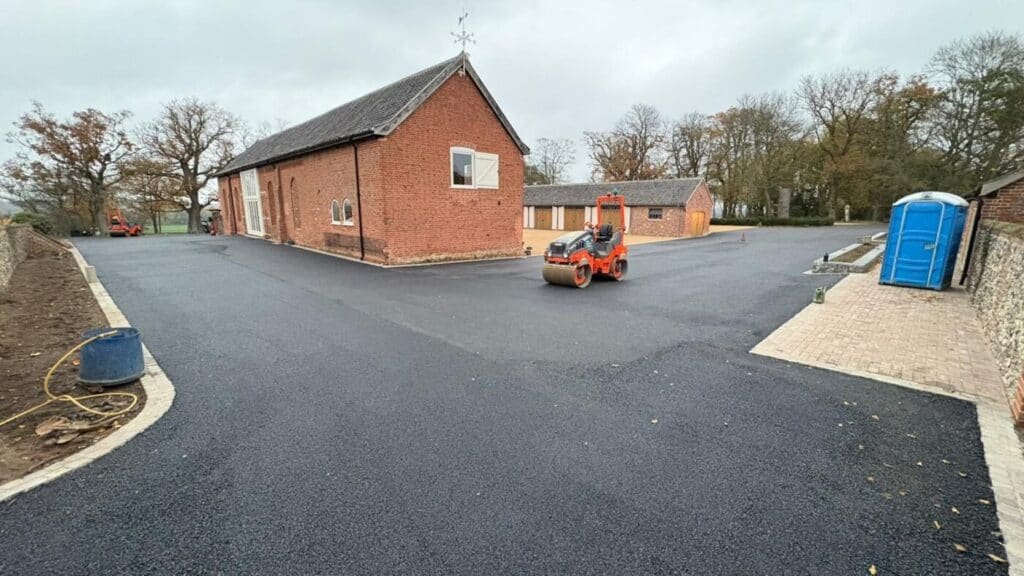 To finish off the grande’ project we have prepared the yard area by laying additional granite sets along the boarders and buildings, laid 100mm approx. of tarmac through our tarmac laying machine to form a strong durable base throughout. The surface was left for 3 days for the oils to wash off before the next surfacing phase.